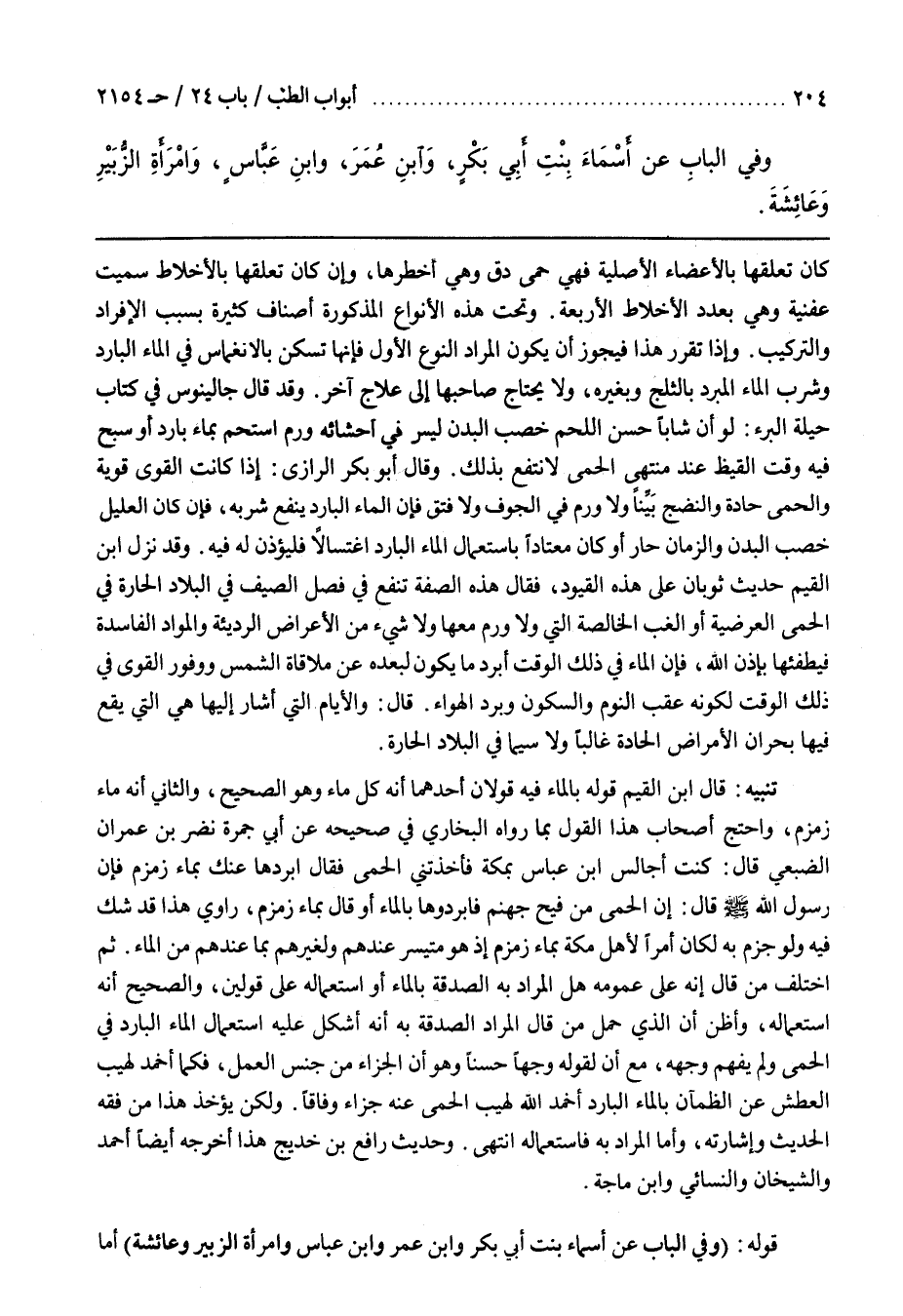 تنبيه قال بن الْقَيِّمِ قَوْلُهُ بِالْمَاءِ فِيهِ قَوْلَانِ أَحَدُهُمَا أَنَّهُ كُلُّ مَاءٍ وَهُوَ الصَّحِيحُ وَالثَّانِي أَنَّهُ مَاءُ زَمْزَمَ وَاحْتَجَّ أَصْحَابُ هَذَا الْقَوْلِ بِمَا رَوَاهُ الْبُخَارِيُّ فِي صَحِيحِهِ عَنْ أَبِي جَمْرَةَ نَضْرِ بن عمران الضبعي قال كنت أجالس بن عَبَّاسٍ بِمَكَّةَ فَأَخَذَتْنِي الْحُمَّى فَقَالَ ابْرُدْهَا عَنْكَ بِمَاءِ زَمْزَمَ فَإِنَّ رَسُولَ اللَّهِ صَلَّى اللَّهُ عَلَيْهِ وَسَلَّمَ قَالَ إِنَّ الْحُمَّى مِنْ فَيْحِ جَهَنَّمَ فَابْرُدُوهَا بِالْمَاءِ أَوْ قَالَ بِمَاءِ زَمْزَمَ رَاوِي هَذَا قَدْ شَكَّ فِيهِ وَلَوْ جَزَمَ بِهِ لَكَانَ أَمْرًا لِأَهْلِ مَكَّةَ بِمَاءِ زَمْزَمَ إِذْ هُوَ مُتَيَسِّرٌ عِنْدَهُمْ وَلِغَيْرِهِمْ بِمَا عِنْدَهُمْ مِنَ الْمَاءِ