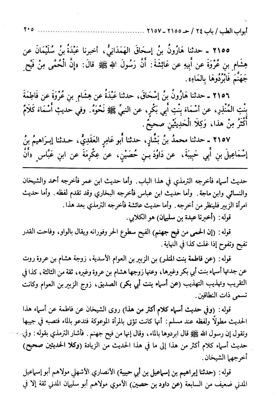 قَوْلُهُ (وَفِي حَدِيثِ أَسْمَاءَ كَلَامٌ أَكْثَرُ مِنْ هَذَا) رَوَى الشَّيْخَانِ عَنْ فَاطِمَةَ عَنْ أَسْمَاءَ هَذَا الْحَدِيثَ مُطَوَّلًا وَلَفْظُهُ عِنْدَ مُسْلِمٍ أَنَّهَا كَانَتْ تُؤْتَى بِالْمَرْأَةِ الْمَوْعُوكَةِ فَتَدْعُو بِالْمَاءِ فَتَصُبُّهُ فِي جَيْبِهَا وَتَقُولُ إِنَّ رَسُولَ اللَّهِ صَلَّى اللَّهُ عَلَيْهِ وَسَلَّمَ قَالَ ابْرُدُوهَا بِالْمَاءِ وَقَالَ إِنَّهَا مِنْ فَيْحِ جَهَنَّمَ