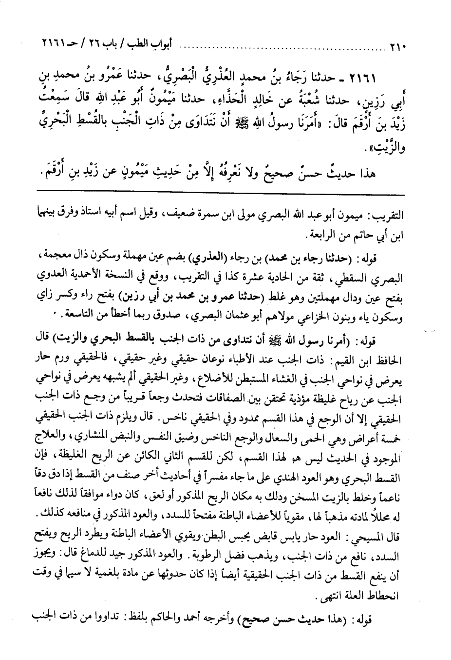 قَوْلُهُ (أَمَرَنَا رَسُولُ اللَّهِ صَلَّى اللَّهُ عَلَيْهِ وَسَلَّمَ أَنْ نَتَدَاوَى مِنْ ذَاتِ الْجَنْبِ بِالْقُسْطِ الْبَحْرِيِّ والزيت) قال الحافظ بن الْقَيِّمِ ذَاتُ الْجَنْبِ عِنْدَ الْأَطِبَّاءِ نَوْعَانِ حَقِيقِيٌّ وَغَيْرُ حَقِيقِيٍّ فَالْحَقِيقِيُّ وَرَمٌ حَارٌّ يَعْرِضُ فِي نَوَاحِي الْجَنْبِ فِي الْغِشَاءِ الْمُسْتَبْطِنِ لِلْأَضْلَاعِ وَغَيْرُ الْحَقِيقِيِّ أَلَمٌ يُشْبِهُهُ يَعْرِضُ فِي نَوَاحِي الْجَنْبِ عَنْ رِيَاحٍ غَلِيظَةٍ مُؤْذِيَةٍ تَحْتَقِنُ بَيْنَ الصَّفَاقَاتِ فَتُحْدِثُ وَجَعًا قَرِيبًا مِنْ وَجَعِ ذَاتِ الْجَنْبِ الْحَقِيقِيِّ إِلَّا أَنَّ الْوَجَعَ فِي هَذَا الْقِسْمِ مَمْدُودٌ وَفِي الْحَقِيقِيِّ نَاخِسٌ قَالَ وَيَلْزَمُ ذَاتِ الْجَنْبِ الْحَقِيقِيِّ خَمْسَةُ أَعْرَاضٍ وَهِيَ الْحُمَّى وَالسُّعَالُ وَالْوَجَعُ النَّاخِسُ وَضِيقُ النَّفَسِ وَالنَّبْضُ الْمِنْشَارِيُّ وَالْعِلَاجُ الْمَوْجُودُ فِي الْحَدِيثِ لَيْسَ هُوَ لِهَذَا الْقِسْمِ لَكِنْ لِلْقِسْمِ الثَّانِي الْكَائِنِ عَنِ الرِّيحِ الْغَلِيظَةِ فَإِنَّ الْقُسْطَ الْبَحْرِيَّ وَهُوَ الْعُودُ الْهِنْدِيُّ عَلَى مَا جَاءَ مُفَسَّرًا فِي أَحَادِيثَ أُخَرِ صِنْفٍ مِنَ الْقُسْطِ إِذَا دُقَّ دَقًّا نَاعِمًا وَخُلِطَ بِالزَّيْتِ الْمُسَخَّنِ وَدُلِّكَ بِهِ مَكَانَ الرِّيحِ الْمَذْكُورِ أَوْ لُعِقَ كَانَ دَوَاءً مُوَافِقًا لِذَلِكَ نَافِعًا لَهُ مُحَلِّلًا لِمَادَّتِهِ مُذْهِبًا لَهَا مُقَوِّيًا لِلْأَعْضَاءِ الْبَاطِنَةِ مُفَتِّحًا لِلسُّدَدِ وَالْعُودُ الْمَذْكُورَةُ فِي مَنَافِعِهِ كَذَلِكَ