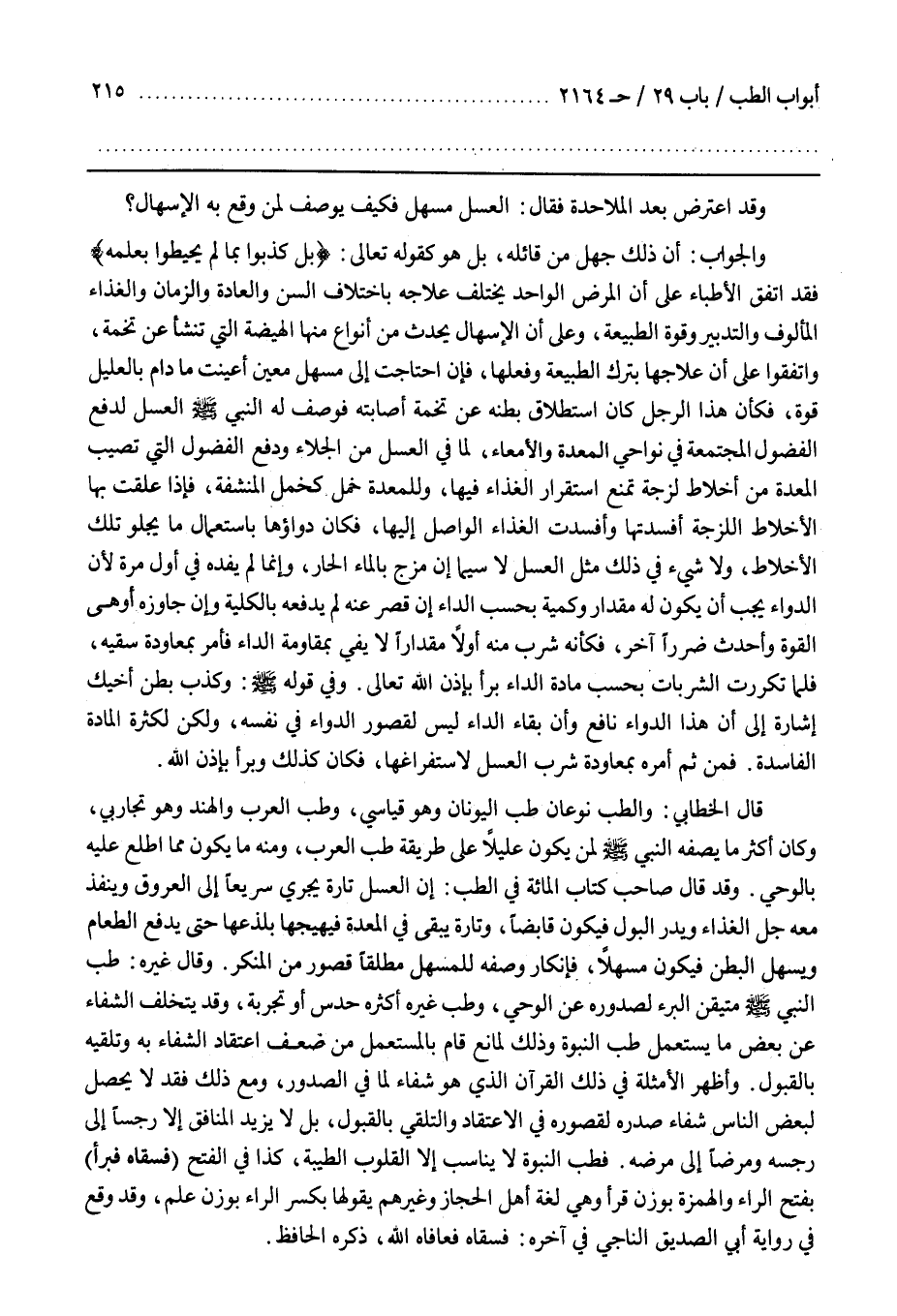 وقد اعترض بعد الْمَلَاحِدَةِ فَقَالَ الْعَسَلُ مُسَهِّلٌ فَكَيْفَ يُوصَفُ لِمَنْ وَقَعَ بِهِ الْإِسْهَالُ وَالْجَوَابُ أَنَّ ذَلِكَ جَهْلٌ مِنْ قَائِلِهِ بَلْ هُوَ كَقَوْلِهِ تَعَالَى بَلْ كذبوا بما لم يحيطوا بعلمه فَقَدِ اتَّفَقَ الْأَطِبَّاءُ عَلَى أَنَّ الْمَرَضَ الْوَاحِدَ يَخْتَلِفُ عِلَاجُهُ بِاخْتِلَافِ السِّنِّ وَالْعَادَةِ وَالزَّمَانِ وَالْغِذَاءِ الْمَأْلُوفِ وَالتَّدْبِيرِ وَقُوَّةِ الطَّبِيعَةِ وَعَلَى أَنَّ الْإِسْهَالَ يَحْدُثُ مِنْ أَنْوَاعٍ مِنْهَا الْهَيْضَةُ الَّتِي تَنْشَأُ عَنْ تُخَمَةٍ وَاتَّفَقُوا عَلَى أَنَّ عِلَاجَهَا بِتَرْكِ الطَّبِيعَةِ وَفِعْلِهَا فَإِنِ احْتَاجَتْ إِلَى مُسَهِّلٍ مُعَيَّنٍ أُعِينَتْ مَا دَامَ بِالْعَلِيلِ قُوَّةٌ فَكَأَنَّ هَذَا الرَّجُلَ كَانَ اسْتِطْلَاقُ بَطْنِهِ عَنْ تُخَمَةٍ أَصَابَتْهُ فَوَصَفَ لَهُ النَّبِيُّ صَلَّى اللَّهُ عَلَيْهِ وَسَلَّمَ الْعَسَلَ لِدَفْعِ الْفُضُولِ الْمُجْتَمِعَةِ فِي نَوَاحِي الْمَعِدَةِ وَالْأَمْعَاءِ لِمَا فِي الْعَسَلِ مِنَ الْجَلَاءِ وَدَفْعِ الْفُضُولِ الَّتِي تُصِيبُ الْمَعِدَةَ مِنْ أَخْلَاطٍ لَزِجَةٍ تَمْنَعُ اسْتِقْرَارَ الْغِذَاءِ فِيهَا وَلِلْمَعِدَةِ خَمْلٌ كَخَمْلِ الْمِنْشَفَةِ فَإِنْ عَلِقَتْ بِهَا الْأَخْلَاطُ اللَّزِجَةُ أَفْسَدَتْهَا وَأَفْسَدَتِ الْغِذَاءَ الْوَاصِلَ إِلَيْهَا فَكَانَ دَوَاؤُهَا بِاسْتِعْمَالِ مَا يَجْلُو تِلْكَ الْأَخْلَاطَ وَلَا شَيْءَ فِي ذَلِكَ مِثْلُ الْعَسَلِ لَا سِيَّمَا إِنْ مُزِجَ بِالْمَاءِ الْحَارِّ وَإِنَّمَا لَمْ يُفِدْهُ فِي أَوَّلِ مَرَّةٍ لِأَنَّ الدَّوَاءَ يَجِبُ أَنْ يَكُونَ لَهُ مِقْدَارٌ وَكَمِّيَّةٌ بِحَسَبِ الدَّاءِ إِنْ قَصُرَ عَنْهُ لَمْ يَدْفَعْهُ بِالْكُلِّيَّةِ وَإِنْ جَاوَزَهُ أَوْهَى الْقُوَّةَ وَأَحْدَثَ ضَرَرًا آخَرَ فَكَأَنَّهُ شَرِبَ مِنْهُ أَوَّلًا مِقْدَارًا لَا يَفِي بِمُقَاوَمَةِ الدَّاءِ فَأَمَرَ بِمُعَاوَدَةِ سَقْيِهِ فَلَمَّا تَكَرَّرَتِ الشَّرَبَاتُ بِحَسَبِ مَادَّةِ الدَّاءِ بَرَأَ بِإِذْنِ اللَّهِ تَعَالَى