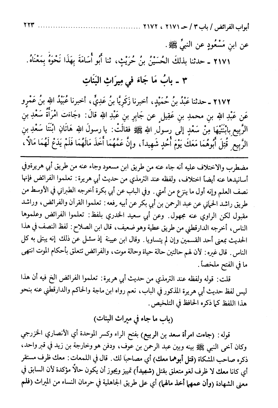 قُلْتُ قَوْلُهُ وَلَفْظُهُ عِنْدَ التِّرْمِذِيِّ مِنْ حَدِيثِ أَبِي هُرَيْرَةَ تَعَلَّمُوا الْفَرَائِضَ إِلَخْ فِيهِ أَنَّ هَذَا لَيْسَ لَفْظَ حَدِيثِ أَبِي هُرَيْرَةِ الْمَذْكُورِ في الباب نعم رواه بن مَاجَهْ وَالْحَاكِمُ وَالدَّارَقُطْنِيُّ عَنْهُ بِنَحْوِ هَذَا اللَّفْظِ كَمَا ذَكَرَهُ الْحَافِظُ فِي التَّلْخِيصِ
