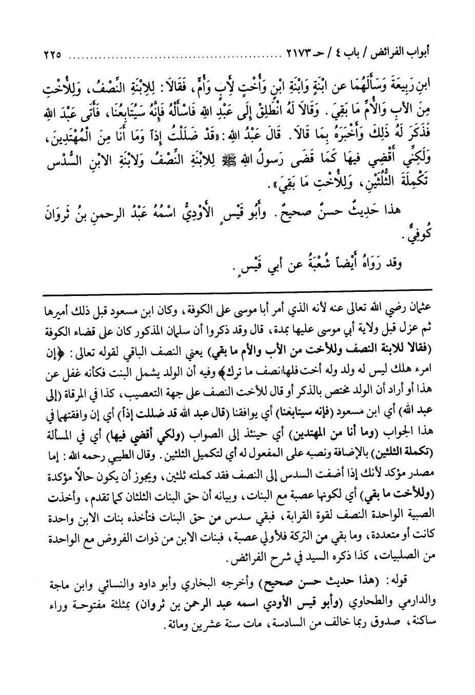 عثمان رضي الله تعالى عنه لأنه الْوَلَدَ يَشْمَلُ الْبِنْتَ فَكَأَنَّهُ غَفَلَ عَنْ هَذَا أَوْ أَرَادَ أَنَّ الْوَلَدَ مُخْتَصٌّ بِالذَّكَرِ أَوْ قَالَ لِلْأُخْتِ النِّصْفُ عَلَى جِهَةِ التَّعْصِيبِ كَذَا في المرقاة (إلى عبد الله) أي بن مَسْعُودٍ (فَإِنَّهُ سَيُتَابِعُنَا) أَيْ يُوَافِقُنَا (قَالَ عَبْدُ اللَّهِ قَدْ ضَلَلْتُ إِذًا) أَيْ إِنْ وَافَقْتهمَا فِي هَذَا الْجَوَابِ (وَمَا أَنَا مِنَ الْمُهْتَدِينَ) أَيْ حِينَئِذٍ إِلَى الصَّوَابِ (وَلَكِنِّي أَقْضِي فِيهَا) أَيْ فِي الْمَسْأَلَةِ (تَكْمِلَةَ الثُّلُثَيْنِ بِالْإِضَافَةِ وَنَصْبُهُ عَلَى الْمَفْعُولِ لَهُ أَيْ لِتَكْمِيلِ الثُّلُثَيْنِ) وَقَالَ الطِّيبِيُّ رَحِمَهُ اللَّهُ (إِمَّا مَصْدَرٌ مُؤَكَّدٌ لِأَنَّكَ إِذَا أَضَفْتَ السُّدُسَ إِلَى النِّصْفِ فَقَدْ كَمَّلْتَهُ ثُلُثَيْنِ وَيَجُوزُ أَنْ يَكُونَ حَالًا مُؤَكِّدَةً (وَلِلْأُخْتِ مَا بَقِيَ) أَيْ لِكَوْنِهَا عَصَبَةً مَعَ الْبَنَاتِ وَبَيَانُهُ أَنَّ حَقَّ الْبَنَاتِ الثُّلُثَانِ كَمَا تَقَدَّمَ وَأَخَذَتِ الصَّبِيَّةُ الْوَاحِدَةُ النِّصْفَ لِقُوَّةِ الْقَرَابَةِ فَبَقِيَ سُدُسٌ مِنْ حَقِّ الْبَنَاتِ فَتَأْخُذُهُ بَنَاتُ الِابْنِ وَاحِدَةً كَانَتْ أَوْ مُتَعَدِّدَةً وَمَا بَقِيَ مِنَ التَّرِكَةِ فَلِأَوْلَى عَصَبَةٍ فَبَنَاتُ الِابْنِ مِنْ ذَوَاتِ الْفُرُوضِ مَعَ الْوَاحِدَةِ مِنَ الصُّلْبِيَّاتِ كَذَا ذَكَرَهُ السَّيِّدُ فِي شَرْحِ الْفَرَائِضِ