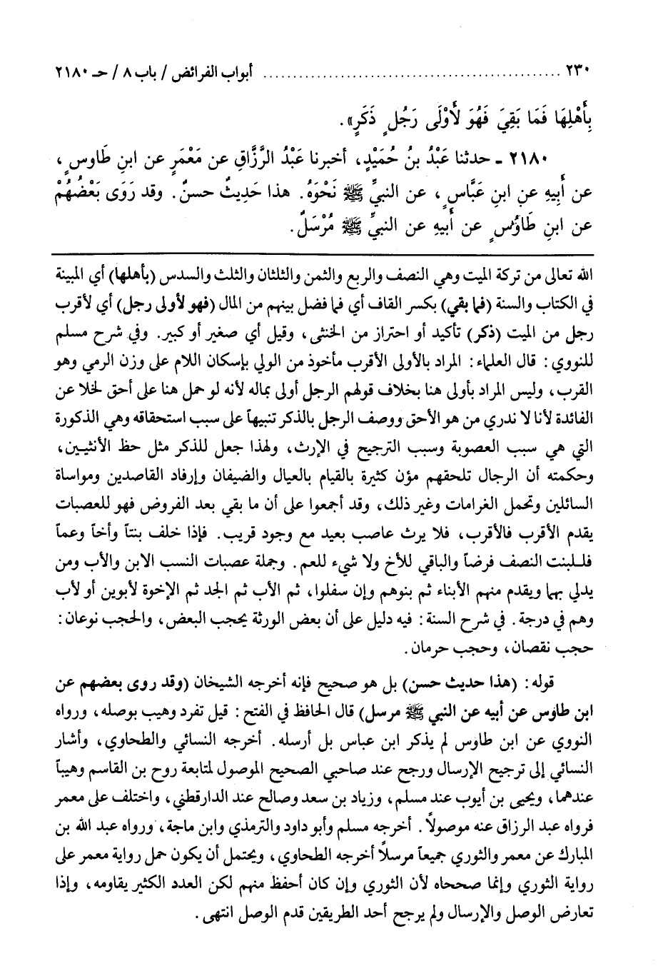اللَّهِ تَعَالَى مِنْ تَرِكَةِ الْمَيِّتِ وَهِيَ النِّصْفُ وَالرُّبُعُ وَالثُّمُنُ وَالثُّلُثَانِ وَالثُّلُثُ وَالسُّدُسُ (بِأَهْلِهَا) أَيِ الْمُبَيَّنَةِ فِي الْكِتَابِ وَالسُّنَّةِ (فَمَا بَقِيَ) بِكَسْرِ الْقَافِ أَيْ فَمَا فَضَلَ بَيْنَهُمْ مِنَ الْمَالِ (فَهُوَ لِأَوْلَى رَجُلٍ) أَيْ لِأَقْرَبِ رَجُلٍ مِنَ الْمَيِّتِ (ذَكَرٍ) تَأْكِيدٌ أَوِ احْتِرَازٌ مِنَ الْخُنْثَى وَقِيلَ أَيْ صَغِيرٌ أَوْ كَبِيرٌ