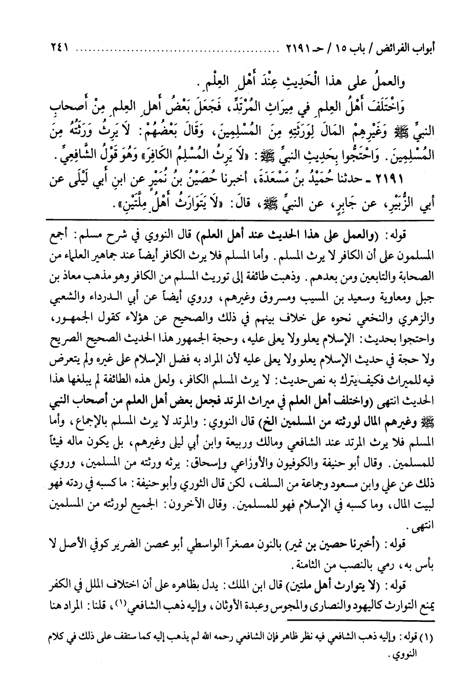 وَذَهَبَتْ طَائِفَةٌ إِلَى تَوْرِيثِ الْمُسْلِمِ مِنَ الْكَافِرِ وَهُوَ مَذْهَبُ مُعَاذِ بْنِ جَبَلٍ وَمُعَاوِيَةَ وَسَعِيدِ بْنِ الْمُسَيِّبِ وَمَسْرُوقٍ وَغَيْرِهِمْ وَرُوِيَ أَيْضًا عَنْ أَبِي الدَّرْدَاءِ وَالشَّعْبِيِّ وَالزُّهْرِيِّ وَالنَّخَعِيِّ نَحْوَهُ عَلَى خِلَافٍ بَيْنَهُمْ فِي ذَلِكَ وَالصَّحِيحُ عَنْ هَؤُلَاءِ كَقَوْلِ الْجُمْهُورِ وَاحْتَجُّوا بِحَدِيثِ الْإِسْلَامُ يَعْلُو وَلَا يُعْلَى عَلَيْهِ وَحُجَّةُ الْجُمْهُورِ هَذَا الْحَدِيثُ الصَّحِيحُ الصَّرِيحُ وَلَا حُجَّةَ فِي حَدِيثِ الْإِسْلَامُ يَعْلُو وَلَا يُعْلَى عَلَيْهِ لِأَنَّ الْمُرَادَ بِهِ فَضْلُ الاسلام على غيره ولم يتعرض فيه الميراث فَكَيْفَ يُتْرَكُ بِهِ نَصُّ حَدِيثِ لَا يَرِثُ الْمُسْلِمُ الْكَافِرَ وَلَعَلَّ هَذِهِ الطَّائِفَةَ لَمْ يَبْلُغْهَا هَذَا الْحَدِيثُ انْتَهَى (وَاخْتَلَفَ أَهْلُ الْعِلْمِ فِي مِيرَاثِ الْمُرْتَدِّ فَجَعَلَ بَعْضُ أَهْلِ الْعِلْمِ مِنْ أَصْحَابِ النَّبِيِّ صَلَّى اللَّهُ عَلَيْهِ وَسَلَّمَ وغيرهم الْمَالَ لِوَرَثَتِهِ مِنَ الْمُسْلِمِينَ إِلَخْ) قَالَ النَّوَوِيُّ وَالْمُرْتَدُّ لَا يَرِثُ الْمُسْلِمَ بِالْإِجْمَاعِ وَأَمَّا الْمُسْلِمُ فَلَا يَرِثُ الْمُرْتَدَّ عِنْدَ الشَّافِعِيِّ وَمَالِكٍ وَرَبِيعَةَ وبن أَبِي لَيْلَى وَغَيْرِهِمْ بَلْ يَكُونُ مَالُهُ فَيْئًا لِلْمُسْلِمِينَ