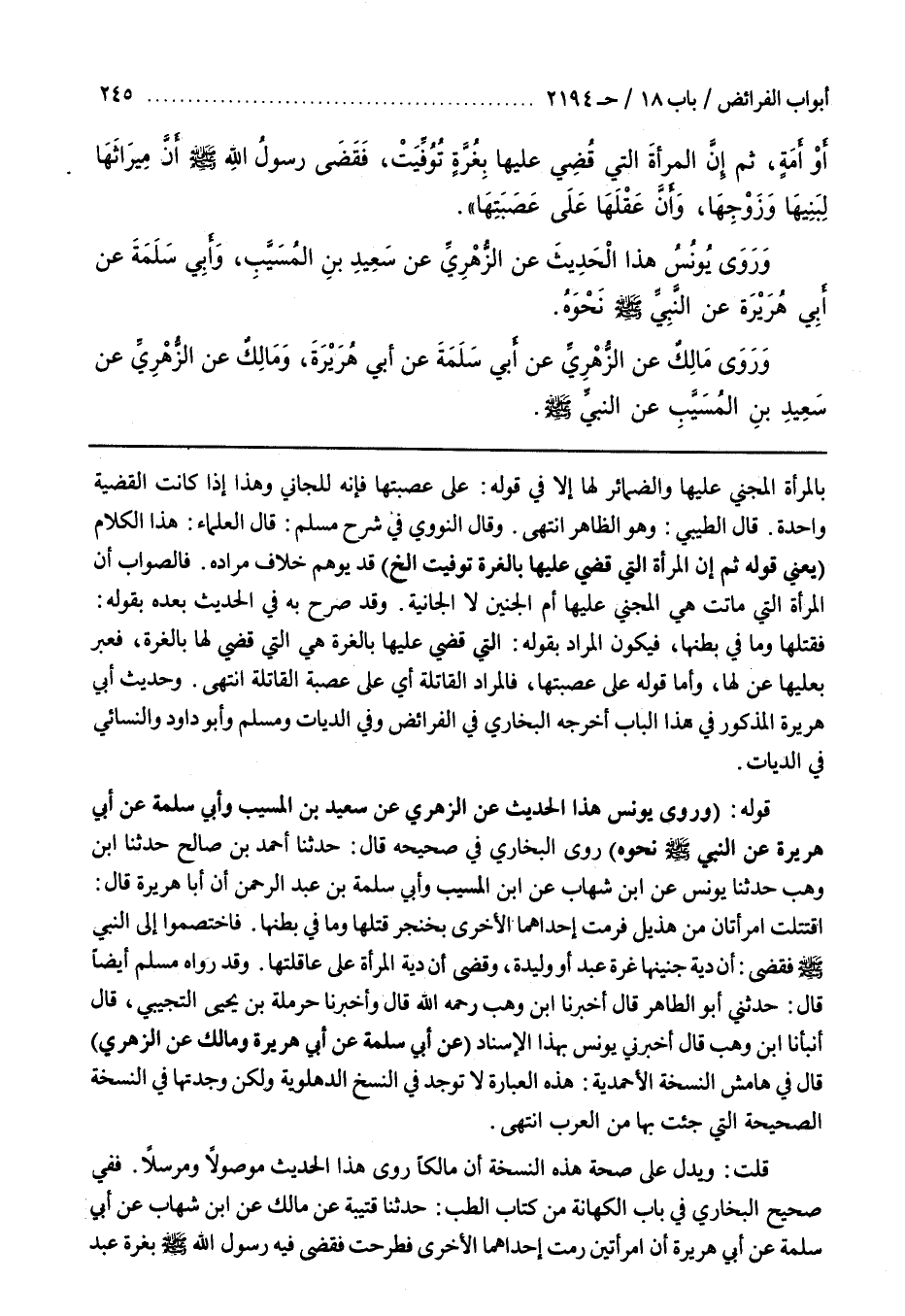فَاخْتَصَمُوا إِلَى النَّبِيِّ صَلَّى اللَّهُ عَلَيْهِ وَسَلَّمَ فَقَضَى أَنَّ دِيَةَ جَنِينِهَا غُرَّةُ عَبْدٍ أو وليدة وقضى دِيَةَ الْمَرْأَةِ عَلَى عَاقِلَتِهَا وَقَدْ رَوَاهُ مُسْلِمٌ أَيْضًا قَالَ حَدَّثَنِي أَبُو الطَّاهِرِ قَالَ أَخْبَرَنَا بن وَهْبٍ رَحِمَهُ اللَّهُ قَالَ وَأَخْبَرَنَا حَرْمَلَةُ بْنُ يحيى التجيبي قال أنبأنا بن وَهْبٍ قَالَ أَخْبَرَنِي يُونُسُ بِهَذَا الْإِسْنَادِ (عَنْ أَبِي سَلَمَةَ عَنْ أَبِي هُرَيْرَةَ وَمَالِكٍ عَنِ الزُّهْرِيِّ) قَالَ فِي هَامِشِ النُّسْخَةِ الْأَحْمَدِيَّةِ هَذِهِ الْعِبَارَةُ لَا تُوجَدُ فِي النُّسَخِ الدَّهْلَوِيَّةِ وَلَكِنْ وَجَدْتُهَا فِي النُّسْخَةِ الصَّحِيحَةِ الَّتِي جِئْتُ بِهَا مِنَ الْعَرَبِ انْتَهَى