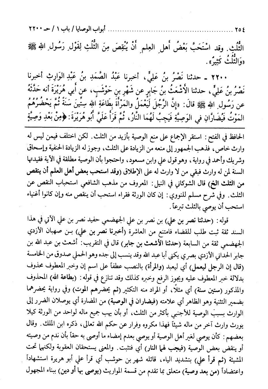 قَوْلُهُ [2117] (حَدَّثَنَا نَصْرُ بْنُ عَلِيِّ) بْنِ نَصْرِ بْنِ عَلِيٍّ الْجَهْضَمِيُّ حَفِيدُ نَصْرِ بْنِ عَلِيٍّ الْآتِي فِي هَذَا السَّنَدِ ثِقَةٌ ثَبْتٌ طُلِبَ لِلْقَضَاءِ فَامْتَنَعَ مِنْ الْعَاشِرَةِ (حَدَّثَنَا نَصْرُ بْنُ عَلِيِّ) بْنِ صُهْبَانَ الْأَزْدِيُّ الْجَهْضَمِيُّ الْبَصْرِيُّ ثِقَةٌ مِنَ السَّابِعَةِ (حدثنا الْأَشْعَثُ بْنُ جَابِرٍ) قَالَ فِي التَّقْرِيبِ أَشْعَثُ بْنُ عَبْدِ اللَّهِ بْنِ جَابِرٍ الْحُدَّانِيُّ الْأَزْدِيُّ بَصْرِيٌّ يُكَنَّى أَبَا عَبْدِ اللَّهِ وَقَدْ يُنْسَبُ إِلَى جَدِّهِ وَهُوَ الْحَمْلِيُّ صَدُوقٌ مِنَ الْخَامِسَةِ (قَالَ إِنَّ الرَّجُلَ لَيَعْمَلَ) أَيْ لَيَعْبُدَ (وَالْمَرْأَةَ) بِالنَّصْبِ عَطْفًا عَلَى اسْمِ إِنَّ وَخَبَرُ الْمَعْطُوفِ مَحْذُوفٌ بِدَلَالَةِ خَبَرِ الْمَعْطُوفِ عَلَيْهِ وَيَجُوزُ الرَّفْعُ وَخَبَرُهُ كَذَلِكَ وَقَدْ تَنَازَعَ فِي قَوْلِهِ (بِطَاعَةِ اللَّهِ) الْمَحْذُوفُ وَالْمَذْكُورُ (سِتِّينَ سَنَةً) أَيْ مَثَلًا أَوِ الْمُرَادُ مِنْهُ التَّكْثِيرُ (ثُمَّ يَحْضُرُهُمُ الْمَوْتُ) وَفِي رِوَايَةٍ يَحْضُرُهُمَا بِضَمِيرِ التَّثْنِيَةِ وَهُوَ الظَّاهِرُ أَيْ عَلَامَتُهُ (فَيُضَارَّانِ فِي الْوَصِيَّةِ) مِنَ الْمُضَارَّةِ أَيْ يُوَصِّلَانِ الضَّرَرَ إِلَى الْوَارِثِ بِسَبَبِ الْوَصِيَّةِ لِلْأَجْنَبِيِّ بِأَكْثَرَ مِنَ الثُّلُثِ أَوْ بِأَنْ يَهَبَ جميع ماله لواحد من الورثة كيلا يورث وارث اخرون مِنْ مَالِهِ شَيْئًا فَهَذَا مَكْرُوهٌ وَفِرَارٌ عَنْ حكم الله تعالى ذكره بن الْمَلَكِ