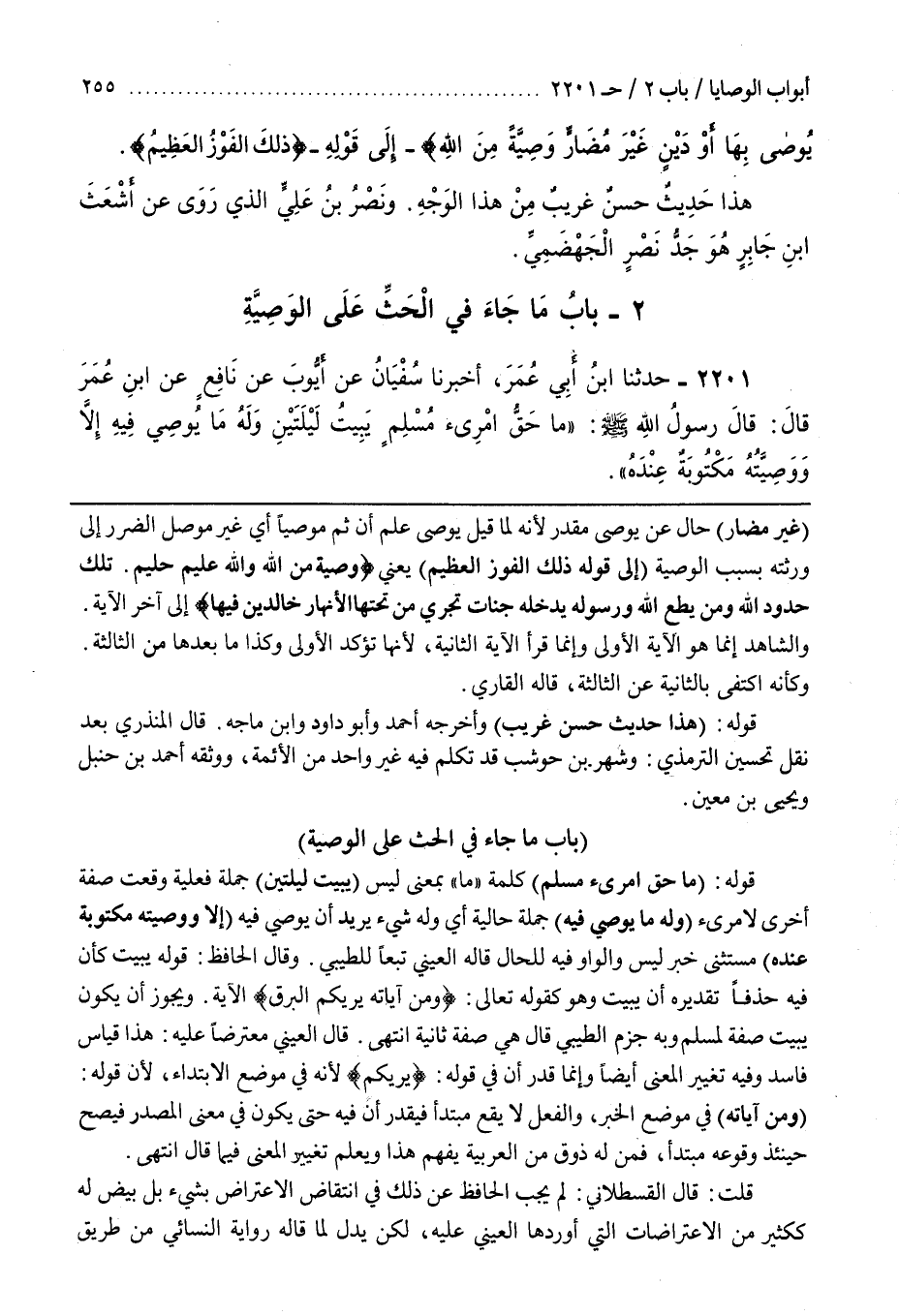 قَوْلُهُ [2118] (مَا حَقُّ امْرِئٍ مُسْلِمٍ) كَلِمَةُ مَا بِمَعْنَى لَيْسَ (يَبِيتُ لَيْلَتَيْنِ) جملة فعلية وقعت صفة أخرى لامرىء (وَلَهُ مَا يُوصِي فِيهِ) جُمْلَةٌ حَالِيَّةٌ أَيْ وَلَهُ شَيْءٌ يُرِيدُ أَنْ يُوصِيَ فِيهِ (إِلَّا وَوَصِيَّتُهُ مَكْتُوبَةٌ عِنْدَهُ) مُسْتَثْنًى خَبَرُ لَيْسَ وَالْوَاوُ فِيهِ لِلْحَالِ قَالَهُ الْعَيْنِيُّ تَبَعًا لِلطِّيبِيِّ