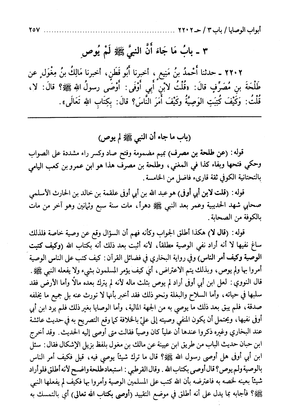 قَالَ النَّوَوِيُّ لَعَلَّ بن أَبِي أَوْفَى أَرَادَ لَمْ يُوصِ بِثُلُثِ مَالِهِ لِأَنَّهُ لَمْ يَتْرُكْ بَعْدَهُ مَالًا وَأَمَّا الْأَرْضُ فَقَدْ سَلَبَهَا فِي حَيَاتِهِ وَأَمَّا السِّلَاحُ وَالْبَغْلَةُ وَنَحْوُ ذَلِكَ فَقَدْ أَخْبَرَ بِأَنَّهَا لَا تُورَثُ عَنْهُ بَلْ جَمِيعُ مَا يَخْلُفُهُ صَدَقَةٌ فَلَمْ يَبْقَ بَعْدَ ذَلِكَ مَا يُوصِي بِهِ مِنَ الْجِهَةِ الْمَالِيَّةِ وَأَمَّا الْوَصَايَا بِغَيْرِ ذَلِكَ فَلَمْ يرد بن أَبِي أَوْفَى نَفْيَهَا وَيُحْتَمَلُ أَنْ يَكُونَ الْمَنْفِيُّ وَصِيَّتَهُ إِلَى عَلِيٍّ بِالْخِلَافَةِ كَمَا وَقَعَ التَّصْرِيحُ بِهِ فِي حَدِيثِ عَائِشَةَ عِنْدَ الْبُخَارِيِّ وَغَيْرِهِ ذَكَرُوا عِنْدَهَا أَنَّ عَلِيًّا كَانَ وَصِيًّا فَقَالَتْ متى أوصى إليه الحديث