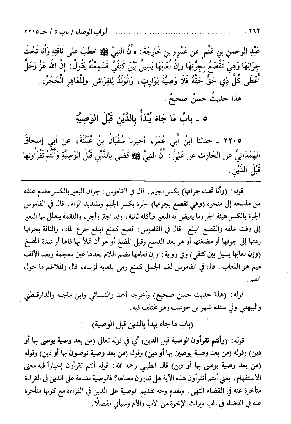 قوله [2122] (وأنتم تقرون الْوَصِيَّةَ قَبْلَ الدَّيْنِ) أَيْ فِي قَوْلِهِ تَعَالَى من بعد وصية يوصي بها أو دين وَقَوْلِهِ مِنْ بَعْدِ وَصِيَّةٍ يُوصِينَ بِهَا أَوْ دين وَقَوْلِهِ مِنْ بَعْدِ وَصِيَّةٍ تُوصُونَ بِهَا أَوْ دين وَقَوْلِهِ مِنْ بَعْدِ وَصِيَّةٍ يُوصَى بِهَا أَوْ دين قال الطيبي رحمه الله قوله أنتم تقرأون إخبار فيه معنى الاستفهام يعني أنتم أتقرأون هَذِهِ الْآيَةَ هَلْ تَدْرُونَ مَعْنَاهَا فَالْوَصِيَّةُ مُقَدَّمَةٌ عَلَى الدَّيْنِ فِي الْقِرَاءَةِ مُتَأَخِّرَةٌ عَنْهُ فِي الْقَضَاءِ انْتَهَى
