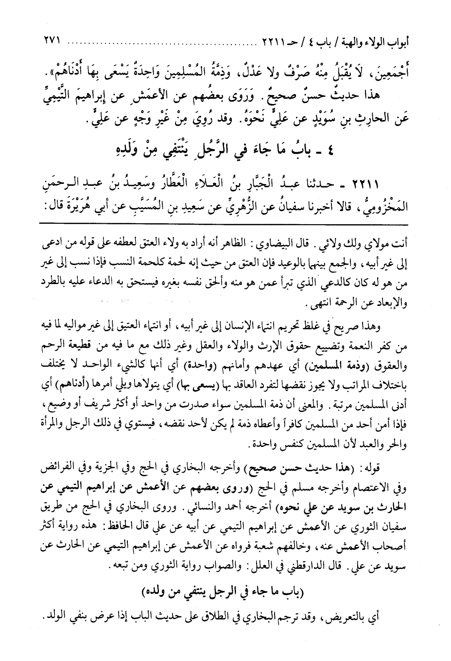 وَهَذَا صَرِيحٌ فِي غِلَظِ تَحْرِيمِ انْتِمَاءِ الْإِنْسَانِ إِلَى غَيْرِ أَبِيهِ أَوِ انْتِمَاءِ الْعَتِيقِ إِلَى غَيْرِ مَوَالِيهِ لِمَا فِيهِ مِنْ كُفْرِ النِّعْمَةِ وَتَضْيِيعِ حُقُوقِ الْإِرْثِ وَالْوَلَاءِ وَالْعَقْلِ وَغَيْرِ ذَلِكَ مَعَ مَا فِيهِ مِنْ قَطِيعَةِ الرَّحِمِ وَالْعُقُوقِ (وَذِمَّةُ الْمُسْلِمِينَ) أَيْ عَهْدُهُمْ وَأَمَانُهُمْ (وَاحِدَةٌ) أَيْ أَنَّهَا كَالشَّيْءِ الْوَاحِدِ لَا يَخْتَلِفُ بِاخْتِلَافِ الْمَرَاتِبِ وَلَا يَجُوزُ نَقْضُهَا لِتَفَرُّدِ الْعَاقِدِ بِهَا (يَسْعَى بِهَا) أَيْ يَتَوَلَّاهَا وَيَلِي أَمْرَهَا (أَدْنَاهُمْ) أَيْ أَدْنَى الْمُسْلِمِينَ مَرْتَبَةً