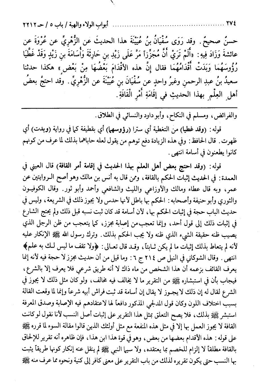 وَقَالَ الْكُوفِيُّونَ وَالثَّوْرِيُّ وَأَبُو حَنِيفَةَ وَأَصْحَابُهُ الْحُكْمُ بِهَا بَاطِلٌ لِأَنَّهَا حَدْسٌ وَلَا يَجُوزُ ذَلِكَ فِي الشَّرِيعَةِ وَلَيْسَ فِي حَدِيثِ الْبَابِ حُجَّةٌ فِي إِثْبَاتِ الْحُكْمِ بِهَا لِأَنَّ أُسَامَةَ قَدْ كَانَ ثَبَتَ نَسَبُهُ قَبْلَ ذَلِكَ وَلَمْ يَحْتَجِ الشَّارِعُ فِي إِثْبَاتِ ذَلِكَ إِلَى قَوْلِ أَحَدٍ وَإِنَّمَا تَعَجَّبَ مِنْ إِصَابَةِ مُجَزِّزٍ كَمَا يَتَعَجَّبُ مِنْ ظَنِّ الرَّجُلِ الَّذِي يُصِيبُ ظَنُّهُ حَقِيقَةَ الشَّيْءِ الَّذِي ظَنَّهُ وَلَا يَجِبُ الْحُكْمُ بِذَلِكَ