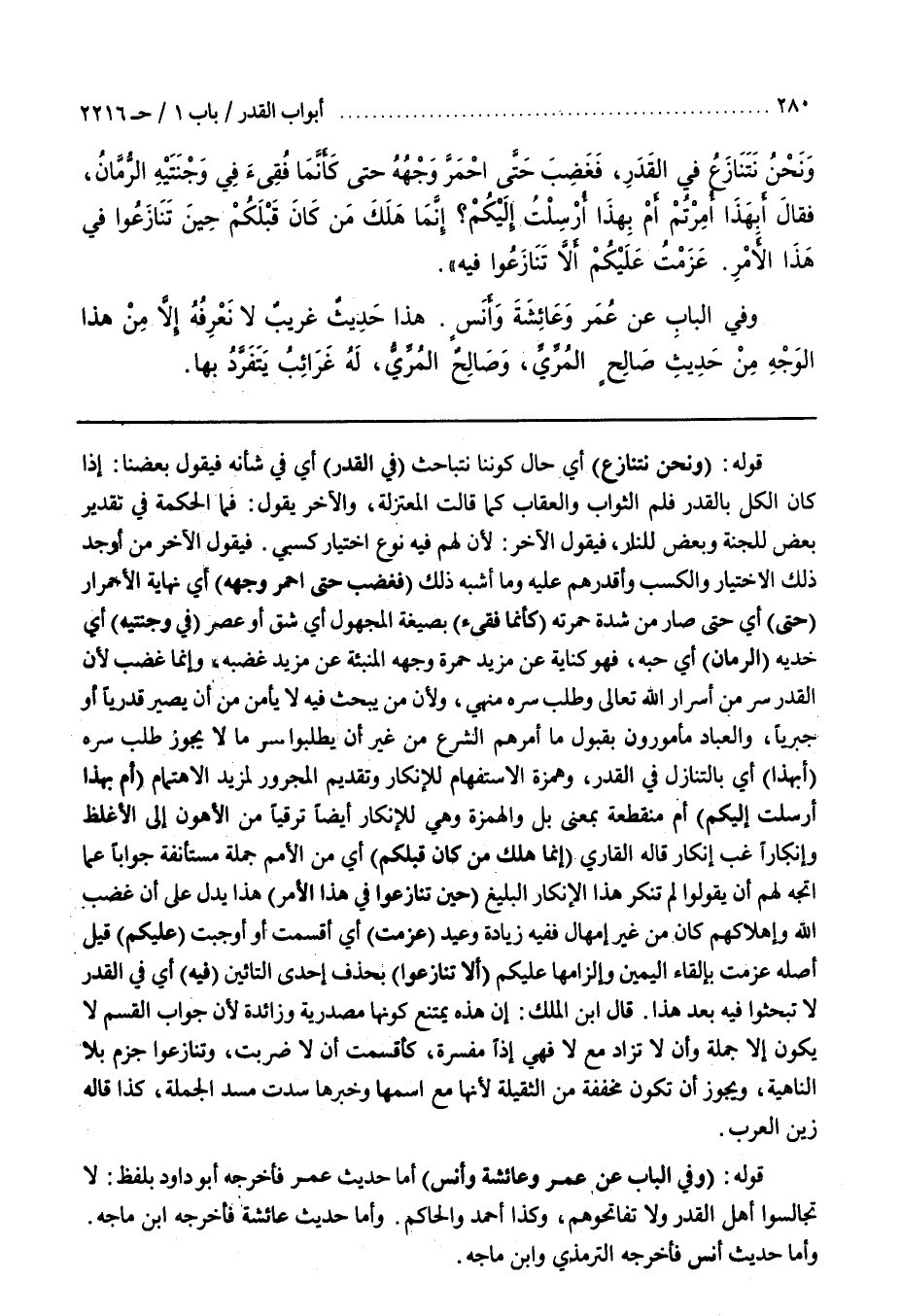 فَيَقُولُ الْآخَرُ مَنْ أَوْجَدَ ذَلِكَ الِاخْتِيَارَ وَالْكَسْبَ وَأَقْدَرَهُمْ عَلَيْهِ وَمَا أَشْبَهَ ذَلِكَ (فَغَضِبَ حَتَّى احْمَرَّ وَجْهُهُ) أَيْ نِهَايَةَ الِاحْمِرَارِ (حَتَّى) أَيْ حتى صار من شدة حمرته (كأنما فقىء) بصيغة المجهول أي شق أوعصر (فِي وَجْنَتَيْهِ) أَيْ خَدَّيْهِ (الرُّمَّانُ) أَيْ حَبُّهُ فَهُوَ كِنَايَةٌ عَنْ مَزِيدِ حُمْرَةِ وَجْهِهِ الْمُنْبِئَةِ عَنْ مَزِيدِ غَضَبِهِ وَإِنَّمَا غَضِبَ لِأَنَّ الْقَدَرَ سِرٌّ مِنْ أَسْرَارِ اللَّهِ تَعَالَى وَطَلَبُ سِرِّهِ مَنْهِيٌّ وَلِأَنَّ مَنْ يَبْحَثُ فِيهِ لَا يَأْمَنُ مِنْ أَنْ يَصِيرَ قَدَرِيًّا أَوْ جَبْرِيًّا وَالْعِبَادُ مَأْمُورُونَ بِقَبُولِ مَا أَمَرَهُمُ الشَّرْعُ مِنْ غَيْرِ أَنْ يَطْلُبُوا سِرَّ مَا لَا يَجُوزُ طَلَبُ سِرِّهِ (أَبِهَذَا) أَيْ بِالتَّنَازُلِ فِي الْقَدَرِ وَهَمْزَةُ الِاسْتِفْهَامِ لِلْإِنْكَارِ وَتَقْدِيمُ الْمَجْرُورِ لِمَزِيدِ الِاهْتِمَامِ (أَمْ بِهَذَا أُرْسِلْتُ إِلَيْكُمْ) أَمْ مُنْقَطِعَةٌ بِمَعْنَى بَلْ وَالْهَمْزَةُ وَهِيَ لِلْإِنْكَارِ أَيْضًا تَرَقِّيًا مِنَ الْأَهْوَنِ إلى الأغلظ وإنكارا غب إنكار قاله القارىء (إِنَّمَا هَلَكَ مَنْ كَانَ قَبْلَكُمْ) أَيْ مِنَ الْأُمَمِ جُمْلَةٌ مُسْتَأْنَفَةٌ جَوَابًا عَمَّا اتُّجِهَ لَهُمْ أَنْ يَقُولُوا لِمَ تُنْكِرْ هَذَا الْإِنْكَارَ الْبَلِيغَ (حِينَ تَنَازَعُوا فِي هَذَا الْأَمْرِ) هَذَا يَدُلُّ عَلَى أَنَّ غَضَبَ اللَّهِ وَإِهْلَاكَهُمْ كَانَ مِنْ غَيْرِ إِمْهَالٍ فَفِيهِ زِيَادَةُ وَعِيدٍ (عَزَمْتُ) أَيْ أَقْسَمْتُ أَوْ أَوْجَبْتُ (عَلَيْكُمْ) قِيلَ أَصْلُهُ عَزَمْتُ بِإِلْقَاءِ الْيَمِينِ وَإِلْزَامِهَا عَلَيْكُمْ (أَلَّا تَنَازَعُوا) بِحَذْفِ إحدى التائين (فِيهِ) أَيْ فِي الْقَدَرِ لَا تَبْحَثُوا فِيهِ بعد هذا
