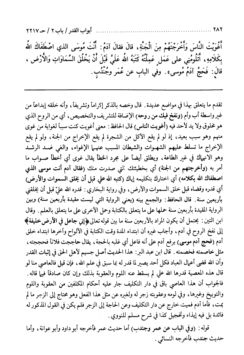 قال بن عَبْدِ الْبَرِّ هَذَا الْحَدِيثُ أَصْلٌ جَسِيمٌ لِأَهْلِ الْحَقِّ فِي إِثْبَاتِ الْقَدَرِ وَأَنَّ اللَّهَ قَضَى أَعْمَالَ الْعِبَادِ فَكُلُّ أَحَدٍ يَصِيرُ لِمَا قُدِّرَ لَهُ بِمَا سَبَقَ فِي عِلْمِ اللَّهِ فَإِنْ قِيلَ فَالْعَاصِي مِنَّا لَوْ قَالَ هَذِهِ الْمَعْصِيَةَ قَدَّرَهَا اللَّهُ عَلَيَّ لَمْ يَسْقُطْ عَنْهُ اللَّوْمُ وَالْعُقُوبَةُ بِذَلِكَ وَإِنْ كَانَ صَادِقًا فِيمَا قَالَهُ فَالْجَوَابُ أَنَّ هَذَا الْعَاصِيَ بَاقٍ فِي دَارِ التَّكْلِيفِ جَارٍ عَلَيْهِ أَحْكَامُ الْمُكَلَّفِينَ مِنَ الْعُقُوبَةِ وَاللَّوْمِ وَالتَّوْبِيخِ وَغَيْرِهَا وَفِي لَوْمِهِ وَعُقُوبَتِهِ زَجْرٌ لَهُ وَلِغَيْرِهِ عَنْ مِثْلِ هَذَا الْفِعْلِ وَهُوَ مُحْتَاجٌ إِلَى الزَّجْرِ مَا لَمْ يَمُتْ فَأَمَّا آدَمُ فَمَيِّتٌ خَارِجٌ عَنْ دَارِ التَّكْلِيفِ وَعَنِ الْحَاجَةِ إِلَى الزَّجْرِ فَلَمْ يَكُنْ فِي الْقَوْلِ الْمَذْكُورِ لَهُ فَائِدَةٌ بَلْ فِيهِ إِيذَاءٌ وَتَخْجِيلٌ كَذَا فِي شَرْحِ مُسْلِمٍ لِلنَّوَوِيِّ