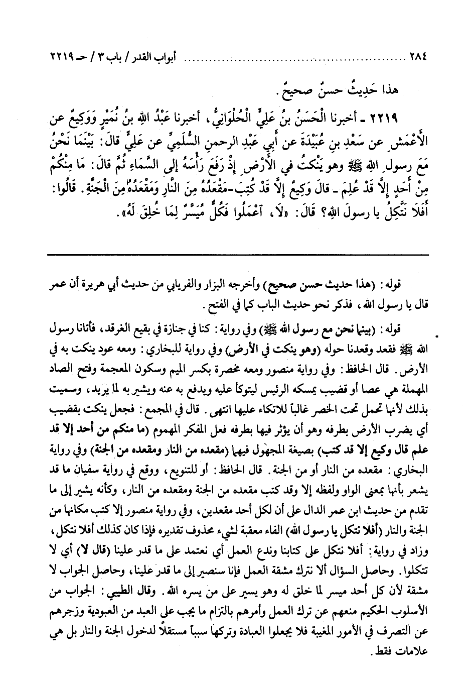 قَالَ فِي الْمَجْمَعِ فَجَعَلَ يَنْكُتُ بِقَضِيبٍ أَيْ يَضْرِبُ الْأَرْضَ بِطَرَفِهِ وَهُوَ أَنْ يُؤَثِّرَ فِيهَا بِطَرَفِهِ فِعْلَ الْمُفَكِّرِ الْمَهْمُومِ (مَا مِنْكُمْ مِنْ أَحَدٍ إِلَّا قَدْ عُلِمَ قَالَ وَكِيعٌ إِلَّا قَدْ كُتِبَ) بِصِيغَةِ الْمَجْهُولِ فِيهِمَا (مَقْعَدُهُ مِنَ النَّارِ وَمَقْعَدُهُ مِنَ الْجَنَّةِ) وَفِي رِوَايَةِ الْبُخَارِيِّ مَقْعَدُهُ مِنَ النَّارِ أَوْ مِنَ الْجَنَّةِ