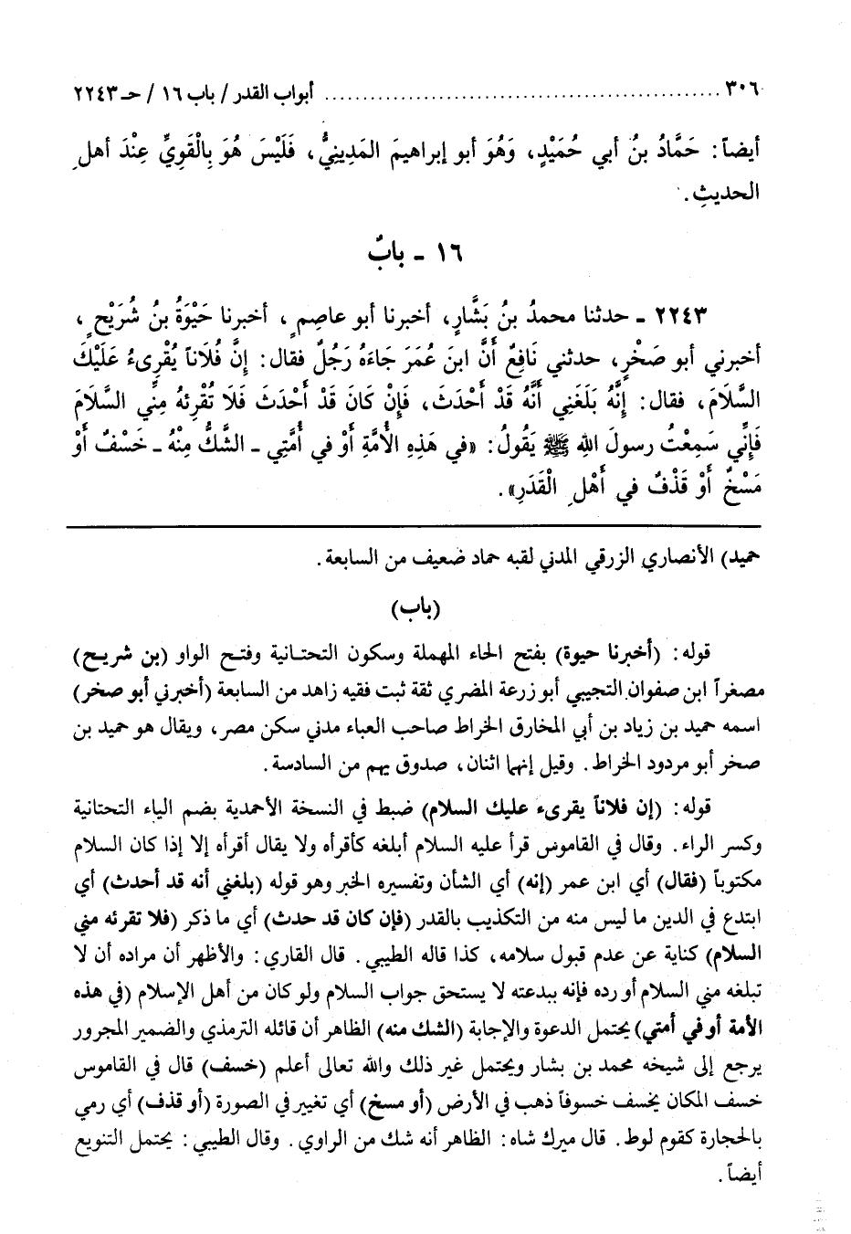 قَالَ القارىء وَالْأَظْهَرُ أَنَّ مُرَادَهُ أَنْ لَا تُبَلِّغْهُ مِنِّي السلام أورده فَإِنَّهُ بِبِدْعَتِهِ لَا يَسْتَحِقُّ جَوَابَ السَّلَامِ وَلَوْ كَانَ مِنْ أَهْلِ الْإِسْلَامِ (فِي هَذِهِ الْأُمَّةِ) (وفي أُمَّتِي) يَحْتَمِلُ الدَّعْوَةَ وَالْإِجَابَةَ (الشَّكُّ مِنْهُ) الظَّاهِرُ أَنَّ قَائِلَهُ التِّرْمِذِيُّ وَالضَّمِيرُ الْمَجْرُورُ يَرْجِعُ إِلَى شَيْخِهِ مُحَمَّدِ بْنِ بَشَّارٍ وَيُحْتَمَلُ غَيْرُ ذَلِكَ وَاللَّهُ تَعَالَى أَعْلَمُ (خَسْفٌ) قَالَ فِي الْقَامُوسِ خسف المكان يخسف خسوفا ذهب في الأرض (أَوْ مَسْخٌ) أَيْ تَغْيِيرٌ فِي الصُّورَةِ (أَوْ قَذْفٌ) أَيْ رَمْيٌ بِالْحِجَارَةِ كَقَوْمِ لُوطٍ