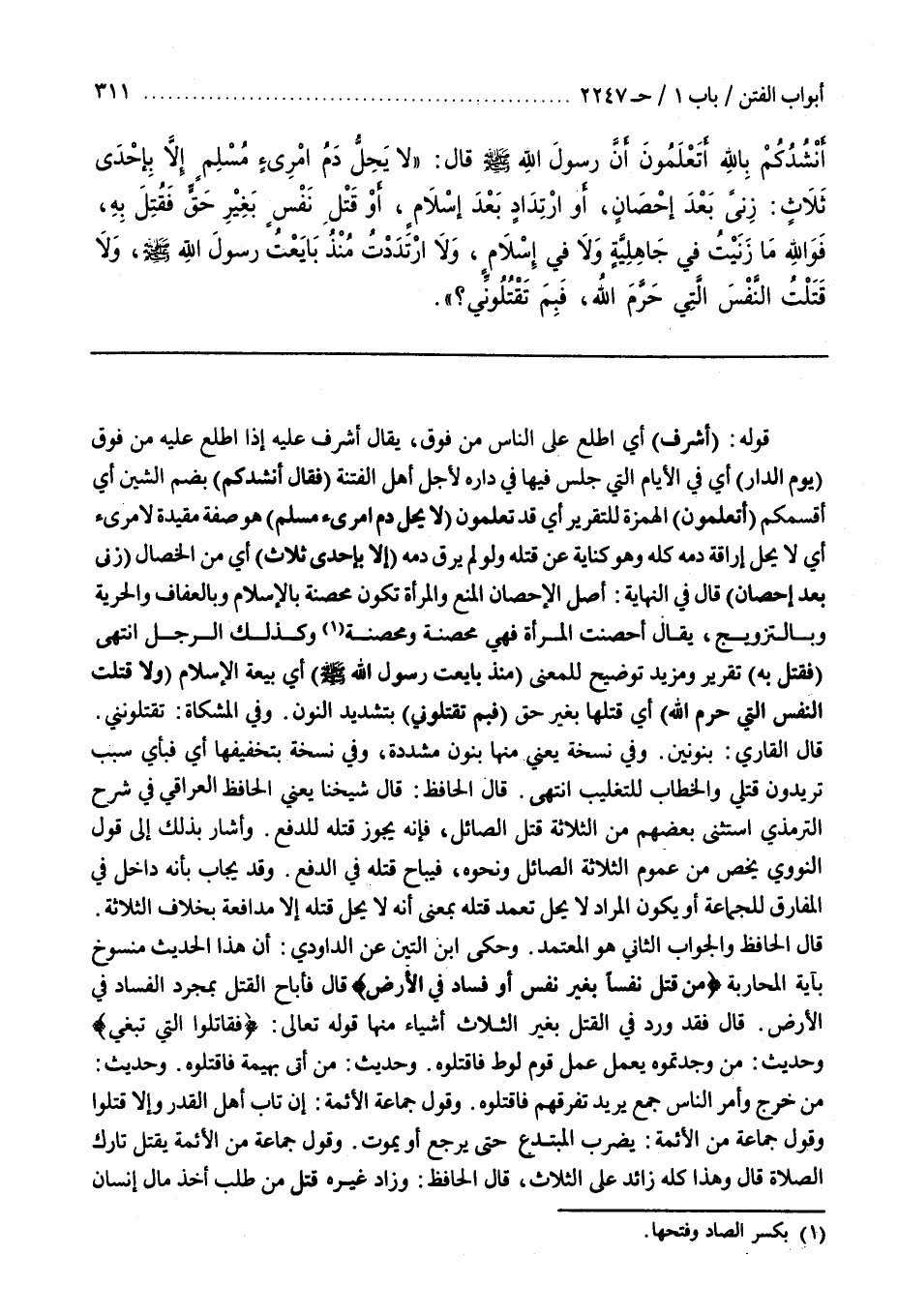 قَوْلُهُ (أَشْرَفَ) أَيِ اطَّلَعَ عَلَى النَّاسِ مِنْ فَوْقٍ يُقَالُ أَشْرَفَ عَلَيْهِ إِذَا اطَّلَعَ عَلَيْهِ مِنْ فَوْقٍ (يَوْمَ الدَّارِ) أَيْ وَقْتَ الْحِصَارِ أَيْ فِي الْأَيَّامِ الَّتِي جَلَسَ فِيهَا فِي دَارِهِ لِأَجْلِ أَهْلِ الْفِتْنَةِ (فَقَالَ أَنْشُدُكُمْ) بِضَمِّ الشِّينِ أَيْ أُقْسِمُكُمْ (أَتَعْلَمُونَ) الْهَمْزَةُ لِلتَّقْرِيرِ أَيْ قَدْ تَعْلَمُونَ (لَا يَحِلُّ دَمُ امْرِئٍ مُسْلِمٍ) هو صفة مقيدة لامرىء أَيْ لَا يَحِلُّ إِرَاقَةُ دَمِهِ كُلِّهِ وَهُوَ كِنَايَةٌ عَنْ قَتْلِهِ وَلَوْ لَمْ يُرِقْ دَمَهُ (إِلَّا بِإِحْدَى ثَلَاثٍ) أَيْ مِنَ الْخِصَالِ (زِنًى بَعْدَ إِحْصَانٍ) قَالَ فِي النِّهَايَةِ أَصْلُ الْإِحْصَانِ الْمَنْعُ وَالْمَرْأَةُ تَكُونُ مُحْصَنَةً بِالْإِسْلَامِ وَبِالْعَفَافِ وَالْحُرِّيَّةِ وَبِالتَّزْوِيجِ يُقَالُ أَحْصَنَتِ الْمَرْأَةُ فَهِيَ مُحْصَنَةٌ وَمُحْصِنَةٌ وَكَذَلِكَ الرَّجُلُ انْتَهَى (فَقُتِلَ بِهِ) تَقْرِيرٌ وَمَزِيدُ تَوْضِيحٍ لِلْمَعْنَى (مُنْذُ بَايَعْتُ رَسُولُ اللَّهِ صَلَّى اللَّهُ عَلَيْهِ وَسَلَّمَ) أَيْ بَيْعَةَ الْإِسْلَامِ (وَلَا قَتَلْتُ النَّفْسَ الَّتِي حَرَّمَ اللَّهُ) أَيْ قَتْلَهَا بِغَيْرِ حَقٍّ (فَبِمَ تَقْتُلُونِّي) بِتَشْدِيدِ النُّونِ