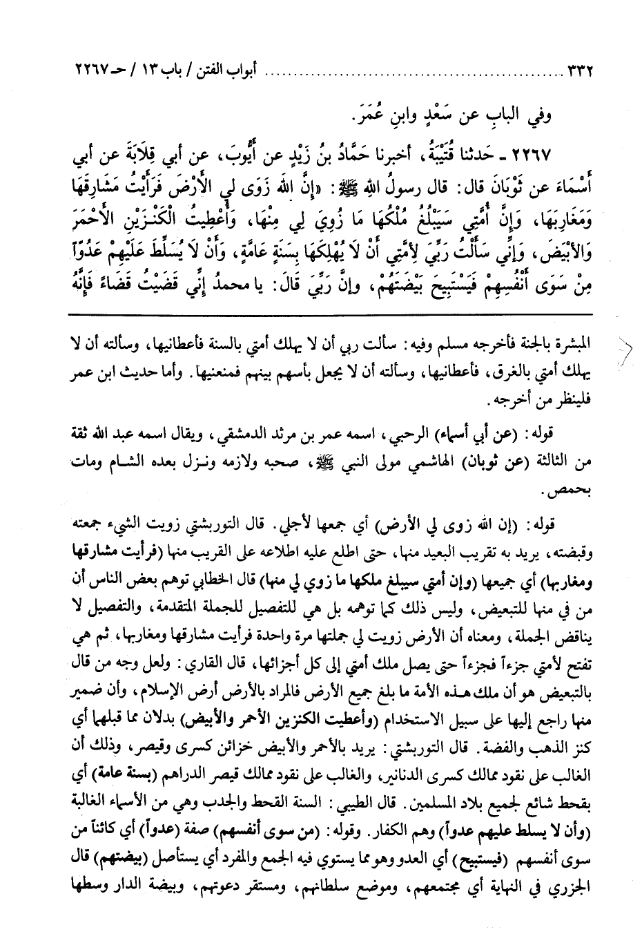 الْمُبَشَّرَةِ بِالْجَنَّةِ فَأَخْرَجَهُ مُسْلِمٌ وَفِيهِ سَأَلْتُ رَبِّي أن لا يهلك أمتي بالسنة فَأَعْطَانِيهَا وَسَأَلْتُهُ أَنْ لَا يُهْلِكَ أُمَّتِي بِالْغَرَقِ فَأَعْطَانِيهَا وَسَأَلْتُهُ أَنْ لَا يَجْعَلَ بَأْسَهُمْ بَيْنَهُمْ فمنعنيها