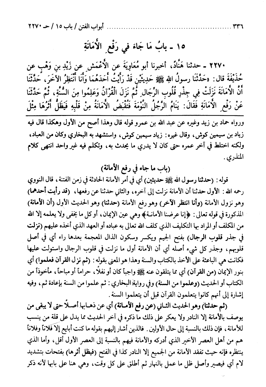 [2179] قَوْلُهُ (حَدَّثَنَا رَسُولُ اللَّهِ صَلَّى اللَّهُ عَلَيْهِ وَسَلَّمَ حَدِيثَيْنِ) أَيْ فِي أَمْرِ الْأَمَانَةِ الْحَادِثَةِ فِي زَمَنِ الْفِتْنَةِ قَالَ النَّوَوِيُّ رَحِمَهُ اللَّهُ الْأَوَّلُ حَدَّثَنَا أَنَّ الْأَمَانَةَ نَزَلَتْ إِلَى آخِرِهِ وَالثَّانِي حَدَّثَنَا عَنْ رَفْعِهَا قَدْ رَأَيْتُ أَحَدَهُمَا وَهُوَ نُزُولُ الْأَمَانَةِ (وَأَنَا أَنْتَظِرُ الْآخَرَ) وَهُوَ رَفْعُ الْأَمَانَةِ (حَدَّثَنَا) وَهُوَ الْحَدِيثُ الْأَوَّلُ (أَنَّ الْأَمَانَةَ) الْمَذْكُورَةَ فِي قَوْلِهِ تعالى إنا عرضنا الأمانة وَهِيَ عَيْنُ الْإِيمَانِ أَوْ كُلُّ مَا يَخْفَى وَلَا يَعْلَمُهُ إِلَّا اللَّهُ مِنَ الْمُكَلَّفِ أَوِ الْمُرَادُ بِهَا التَّكْلِيفُ الَّذِي كَلَّفَ اللَّهُ تَعَالَى بِهِ عِبَادَهُ أَوِ الْعَهْدُ الَّذِي أَخَذَهُ عَلَيْهِمْ (نَزَلَتْ فِي جَذْرِ قُلُوبِ الرِّجَالِ) بِفَتْحِ الْجِيمِ وَيُكْسَرُ وَسُكُونُ الذَّالِ الْمُعْجَمَةِ بَعْدَهَا رَاءٌ أَيْ فِي أَصْلِ قُلُوبِهِمْ وَجَذْرُ كُلِّ شَيْءٍ أَصْلُهُ أَيْ أَنَّ الْأَمَانَةَ أَوَّلَ مَا نَزَلَتْ فِي قُلُوبِ الرِّجَالِ وَاسْتَوْلَتْ عَلَيْهَا فَكَانَتْ هِيَ الْبَاعِثَةُ عَلَى الْأَخْذِ بِالْكِتَابِ وَالسُّنَّةِ وَهَذَا هُوَ الْمُعْنَى بقوله (ثُمَّ نَزَلَ الْقُرْآنُ فَعَلِمُوا) أَيْ بِنُورِ الْإِيمَانِ (مِنَ الْقُرْآنِ) أَيْ مِمَّا يَتَلَقَّوْنَ عَنْهُ صَلَّى اللَّهُ عَلَيْهِ وَسَلَّمَ وَاجِبًا كَانَ أَوْ نَفْلًا حَرَامًا أَوْ مُبَاحًا مَأْخُوذًا مِنَ الْكِتَابِ أَوِ الْحَدِيثِ (وَعَلِمُوا مِنَ السُّنَّةِ) وَفِي رِوَايَةِ الْبُخَارِيِّ ثُمَّ عَلِمُوا مِنَ السُّنَّةِ بِإِعَادَةِ ثُمَّ وَفِيهِ إِشَارَةٌ إِلَى أَنَّهُمْ كَانُوا يَتَعَلَّمُونَ الْقُرْآنَ قَبْلَ أَنْ يَتَعَلَّمُوا السُّنَّةَ
