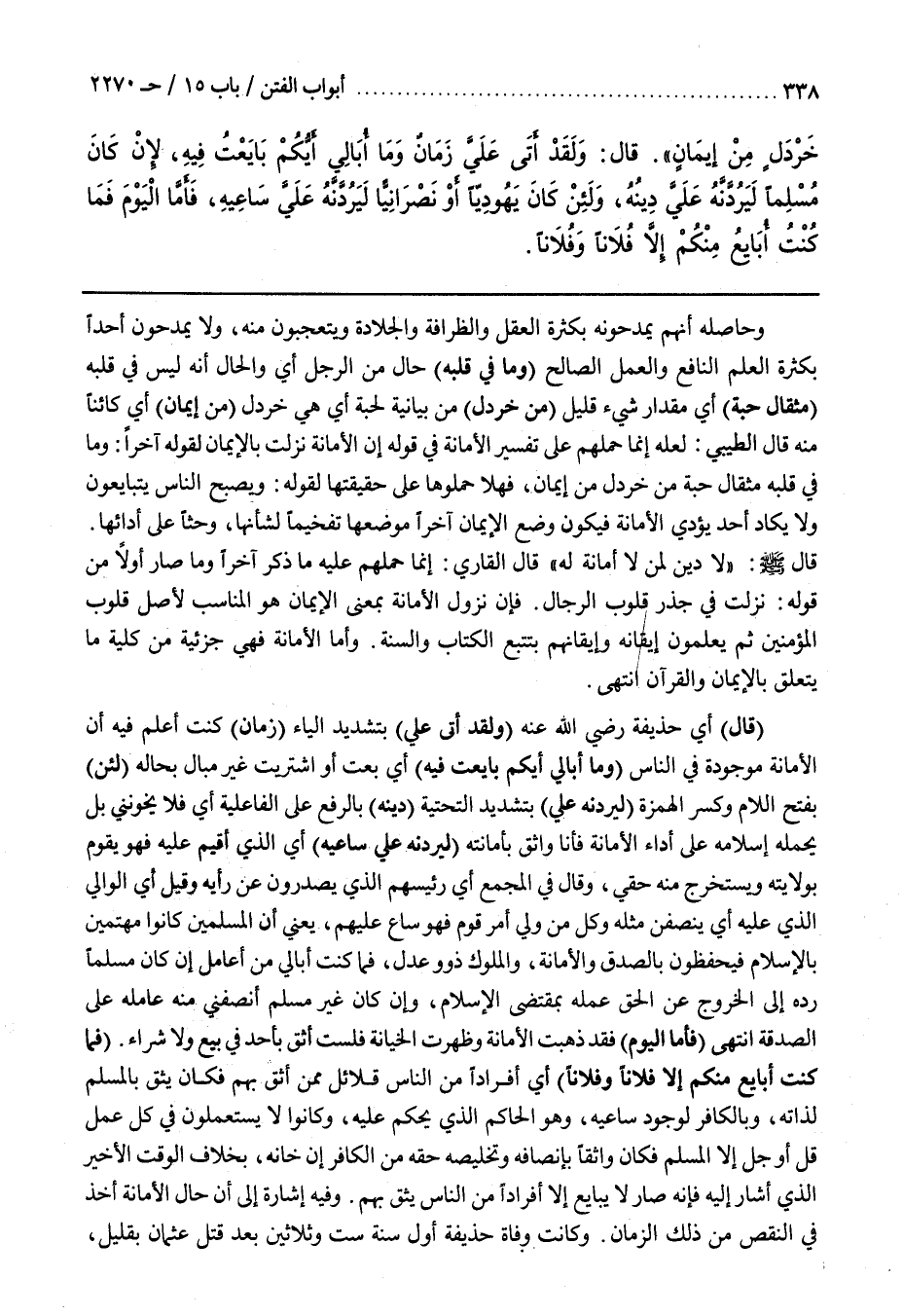 (قَالَ) أَيْ حُذَيْفَةُ رَضِيَ اللَّهُ عَنْهُ (وَلَقَدْ أَتَى عَلَيَّ) بِتَشْدِيدِ الْيَاءِ (زَمَانٌ) كُنْتُ أَعْلَمُ فِيهِ أَنَّ الْأَمَانَةَ مَوْجُودَةٌ فِي النَّاسِ (وَمَا أُبَالِي أَيَّكُمْ بَايَعْتُ فِيهِ) أَيْ بِعْتُ أَوِ اشْتَرَيْتُ غَيْرَ مُبَالٍ بِحَالِهِ (لَئِنْ) بفتح اللَّامِ وَكَسْرُ الْهَمْزَةِ (لَيَرُدَّنَّهُ عَلَيَّ) بِتَشْدِيدِ التَّحْتِيَّةِ (دينه) بالرفع على الفاعيلة أَيْ فَلَا يَخُونُنِي بَلْ يَحْمِلُهُ إِسْلَامُهُ عَلَى أَدَاءِ الْأَمَانَةِ فَأَنَا وَاثِقٌ بِأَمَانَتِهِ (لَيَرُدَّنَّهُ عَلَيَّ سَاعِيهِ) أَيِ الَّذِي أُقِيمُ عَلَيْهِ فَهُوَ يَقُومُ بِوِلَايَتِهِ وَيَسْتَخْرِجُ مِنْهُ حَقِّي وَقَالَ فِي الْمَجْمَعِ أَيْ رَئِيسُهُمُ الَّذِي يَصْدُرُونَ عَنْ رَأْيِهِ وَقِيلَ أَيِ الْوَالِي الَّذِي عَلَيْهِ أَيْ يُنْصِفُنِي مِثْلُهُ وَكُلُّ مَنْ وَلِيَ أَمْرَ قَوْمٍ فَهُوَ سَاعٍ عَلَيْهِمْ يَعْنِي أَنَّ الْمُسْلِمِينَ كَانُوا مُهْتَمِّينَ بِالْإِسْلَامِ فَيَحْفَظُونَ بِالصِّدْقِ وَالْأَمَانَةِ وَالْمُلُوكُ ذَوُو عَدْلٍ فَمَا كُنْتُ أُبَالِي مَنْ أُعَامِلُ إِنْ كَانَ مُسْلِمًا رَدَّهُ إِلَى الْخُرُوجِ عَنِ الْحَقِّ عَمَلُهُ بِمُقْتَضَى الْإِسْلَامِ وَإِنْ كَانَ غَيْرَ مُسْلِمٍ أَنْصَفَنِي مِنْهُ عَامِلُهُ عَلَى الصَّدَقَةِ انْتَهَى (فَأَمَّا الْيَوْمَ) فَقَدْ ذَهَبَتِ الْأَمَانَةُ وَظَهَرَتِ الْخِيَانَةُ فَلَسْتُ أَثِقُ بِأَحَدٍ فِي بَيْعٍ وَلَا شِرَاءٍ