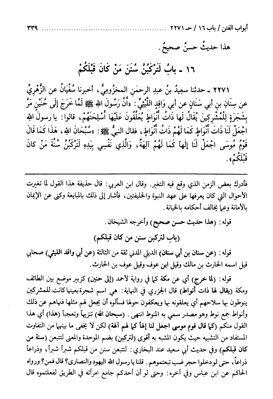 (سُبْحَانَ اللَّهِ) تَنْزِيهًا وَتَعَجُّبًا (هَذَا) أَيْ هَذَا الْقَوْلُ مِنْكُمْ (كَمَا قَالَ قَوْمُ مُوسَى اجْعَلْ لَنَا إِلَهًا كما لهم الهة) لَكِنْ لَا يَخْفَى مَا بَيْنَهُمَا مِنَ التَّفَاوُتِ الْمُسْتَفَادُ مِنَ التَّشْبِيهِ حَيْثُ يَكُونُ الْمُشَبَّهُ بِهِ أَقْوَى (لَتَرْكَبُنَّ) بِضَمِّ الْمُوَحَّدَةِ وَالْمَعْنَى لَتَتَّبِعُنَّ (سُنَّةَ مَنْ كَانَ قَبْلَكُمْ) وَفِي حَدِيثِ أَبِي سَعِيدٍ عِنْدَ الْبُخَارِيِّ لَتَتَّبِعُنَّ سَنَنَ مَنْ قَبْلَكُمْ شِبْرًا شِبْرًا وَذِرَاعًا ذِرَاعًا حَتَّى لَوْ دَخَلُوا جُحْرَ ضَبٍّ تَبِعْتُمُوهُمْ قُلْنَا يَا رَسُولَ اللَّهِ الْيَهُودُ والنصاري