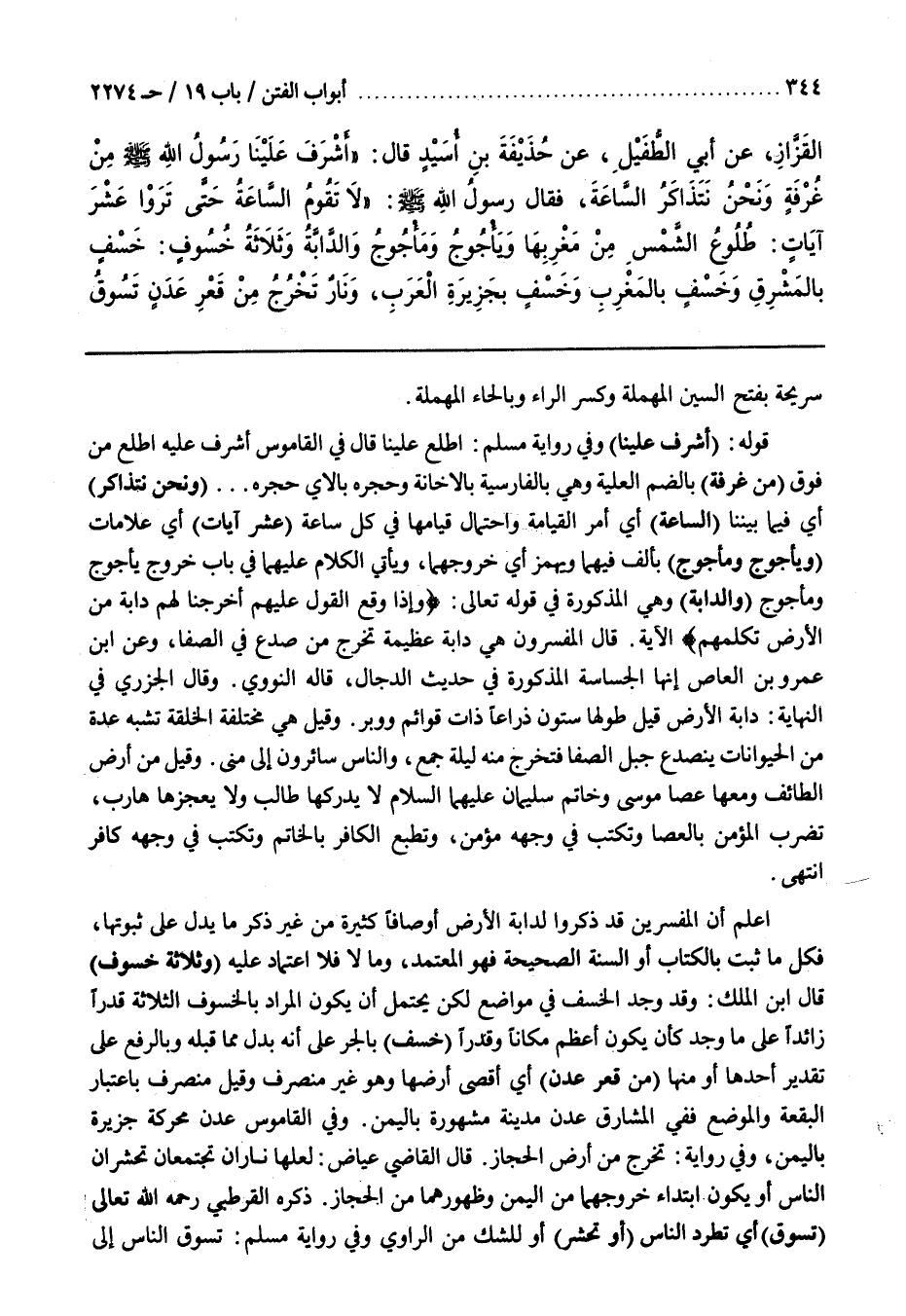 (وَنَحْنُ نَتَذَاكَرُ) أَيْ فِيمَا بَيْنَنَا (السَّاعَةَ) أَيْ أَمْرَ الْقِيَامَةِ وَاحْتِمَالَ قِيَامِهَا فِي كُلِّ سَاعَةٍ (عَشْرَ آيَاتٍ) أَيْ عَلَامَاتٍ (وَيَأْجُوجَ وَمَأْجُوجَ) بِأَلِفٍ فِيهِمَا وَيُهْمَزُ أَيْ خُرُوجَهُمَا وَيَأْتِي الْكَلَامُ عَلَيْهِمَا فِي بَابِ خُرُوجِ يَأْجُوجَ وَمَأْجُوجَ (وَالدَّابَّةَ) وَهِيَ الْمَذْكُورَةُ فِي قَوْلِهِ تَعَالَى وَإِذَا وَقَعَ الْقَوْلُ عَلَيْهِمْ أَخْرَجْنَا لَهُمْ دَابَّةً مِنَ الْأَرْضِ تُكَلِّمُهُمْ الْآيَةَ