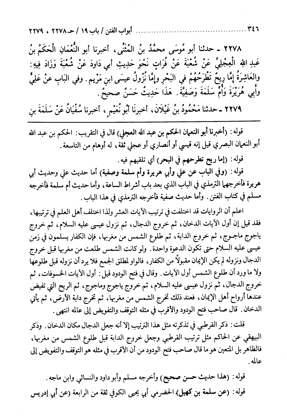 وَذَكَرَ الْبَيْهَقِيُّ عَنِ الْحَاكِمِ مِثْلَ تَرْتِيبِ الْقُرْطُبِيِّ وَجَعَلَ خُرُوجَ الدَّابَّةِ قَبْلَ طُلُوعِ الشَّمْسِ مِنْ مَغْرِبِهَا فَالظَّاهِرُ بَلِ الْمُتَعَيِّنُ هُوَ مَا قَالَ صَاحِبُ فَتْحِ الْوَدُودِ مِنْ أَنَّ الْأَقْرَبَ فِي مِثْلِهِ هُوَ التَّوَقُّفُ وَالتَّفْوِيضُ إِلَى عَالِمِهِ
