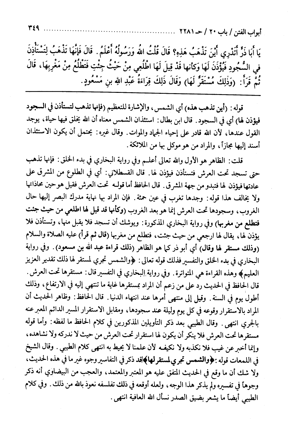 قُلْتُ الظَّاهِرُ هُوَ الْأَوَّلُ وَاللَّهُ تَعَالَى أَعْلَمُ وَفِي رِوَايَةِ الْبُخَارِيِّ فِي بَدْءِ الْخَلْقِ فَإِنَّهَا تَذْهَبُ حَتَّى تَسْجُدَ تَحْتَ الْعَرْشِ فَتَسْتَأْذِنَ فَيُؤْذَنُ لَهَا