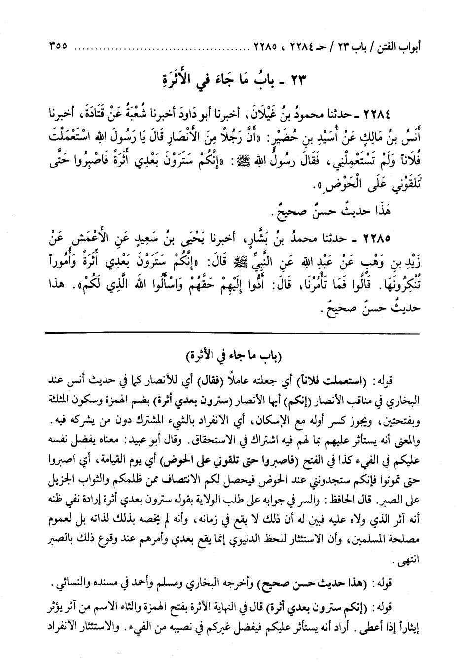 وما جاء فيه [2189] قَوْلُهُ (اسْتَعْمَلْتُ فُلَانًا) أَيْ جَعَلْتُهُ عَامِلًا (فَقَالَ) أَيْ لِلْأَنْصَارِ كَمَا فِي حَدِيثِ أَنَسٍ عِنْدَ الْبُخَارِيِّ فِي مَنَاقِبِ الْأَنْصَارِ (إِنَّكُمْ) أَيُّهَا الْأَنْصَارُ (سَتَرَوْنَ بَعْدِي أُثْرَةً) بِضَمِّ الْهَمْزَةِ وَسُكُونِ الْمُثَلَّثَةِ وَبِفَتْحَتَيْنِ وَيَجُوزُ كَسْرُ أَوَّلِهِ مَعَ الْإِسْكَانِ أَيِ الِانْفِرَادُ بِالشَّيْءِ الْمُشْتَرَكِ دُونَ مَنْ يُشْرِكُهُ فِيهِ