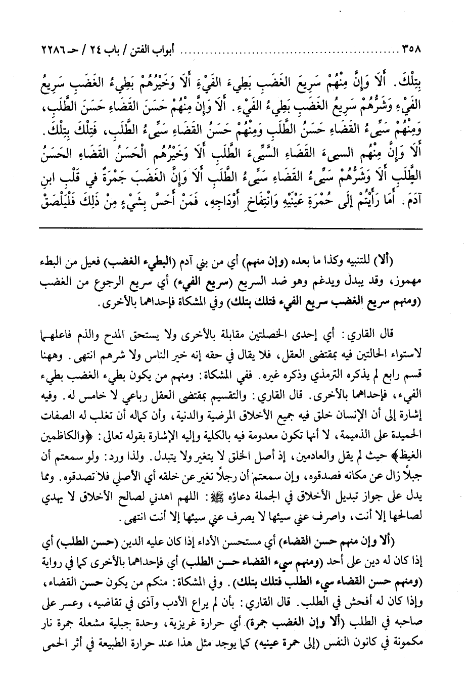 فَفِي الْمِشْكَاةِ وَمِنْهُمْ مَنْ يَكُونُ بَطِيءَ الْغَضَبِ بطيء الفيء فإحداهما بالأخرى