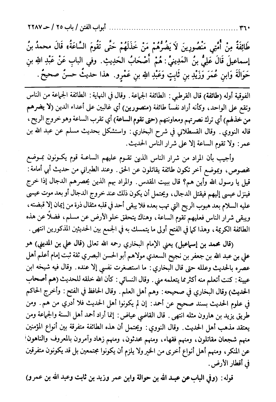 وَقَالَ النَّسَائِيُّ كَأَنَّ اللَّهَ خَلَقَهُ لِلْحَدِيثِ (هُمْ أَصْحَابُ الْحَدِيثِ) وَقَالَ الْبُخَارِيُّ فِي صَحِيحِهِ وَهُمْ أَهْلُ الْعِلْمِ