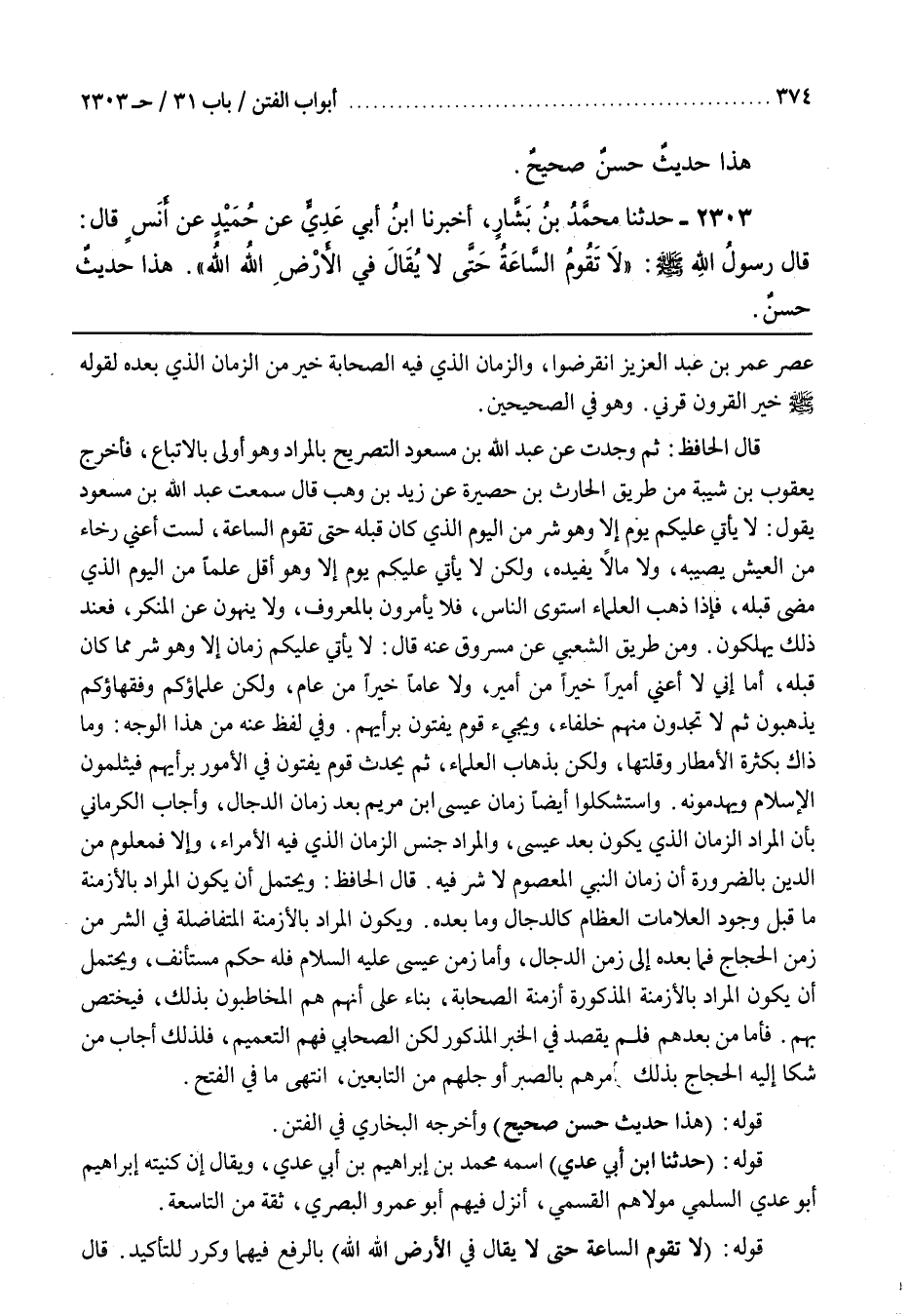 قَالَ الْحَافِظُ ثُمَّ وَجَدْتُ عَنْ عَبْدِ اللَّهِ بْنِ مَسْعُودٍ التَّصْرِيحَ بِالْمُرَادِ وَهُوَ أَوْلَى بِالِاتِّبَاعِ فَأَخْرَجَ يَعْقُوبُ بْنُ شَيْبَةَ مِنْ طَرِيقِ الْحَارِثِ بْنِ حَصِيرَةَ عَنْ زَيْدِ بْنِ وَهْبٍ قَالَ سَمِعْتُ عَبْدَ اللَّهِ بْنَ مَسْعُودٍ يَقُولُ لَا يَأْتِي عَلَيْكُمْ يَوْمٌ إِلَّا وَهُوَ شَرٌّ مِنَ الْيَوْمِ الَّذِي كَانَ قَبْلَهُ حَتَّى تَقُومَ السَّاعَةُ لَسْتُ أَعْنِي رَخَاءً مِنَ الْعَيْشِ يُصِيبُهُ وَلَا مَالًا يُفِيدُهُ وَلَكِنْ لَا يَأْتِي عَلَيْكُمْ يَوْمٌ إِلَّا وَهُوَ أَقَلُّ عِلْمًا مِنَ الْيَوْمِ الَّذِي مَضَى قَبْلَهُ فَإِذَا ذَهَبَ الْعُلَمَاءُ اسْتَوَى النَّاسُ فَلَا يَأْمُرُونَ بِالْمَعْرُوفِ وَلَا يَنْهَوْنَ عَنِ الْمُنْكَرِ فَعِنْدَ ذَلِكَ يَهْلِكُونَ