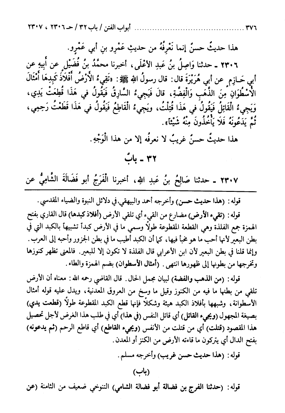 قوله مِنَ الذَّهَبِ وَالْفِضَّةِ لِبَيَانِ مُجْمَلِ الْحَالِ قَالَ الْقَاضِي رَحِمَهُ اللَّهُ مَعْنَاهُ أَنَّ الْأَرْضَ تُلْقِي مِنْ بَطْنِهَا مَا فِيهِ مِنَ الْكُنُوزِ وَقِيلَ ما وسخ مِنَ الْعُرُوقِ الْمَعْدِنِيَّةِ وَيَدُلُّ عَلَيْهِ قَوْلُهُ أَمْثَالَ الْأُسْطُوَانَةِ وَشَبَّهَهَا بِأَفْلَاذِ الْكَبِدِ هَيْئَةً وَشَكْلًا فَإِنَّهَا قِطَعُ الْكَبِدِ الْمَقْطُوعَةِ طُولًا قُطِعَتْ يَدِي بِصِيغَةِ الْمَجْهُولِ وَيَجِيءُ الْقَاتِلُ أَيْ قَاتِلُ النَّفْسِ فِي هَذَا أَيْ فِي طَلَبِ هَذَا الْغَرَضِ لِأَجْلِ تَحْصِيلِ هَذَا الْمَقْصُودِ قُتِلْتُ أَيْ مَنْ قَتَلْتُ مِنَ الْأَنْفُسِ وَيَجِيءُ الْقَاطِعُ أَيْ قَاطِعُ الرَّحِمِ ثُمَّ يَدَعُونَهُ بِفَتْحِ الدَّالِ أَيْ يَتْرُكُونَ مَا قَاءَتْهُ الْأَرْضُ مِنَ الْكَنْزِ أَوِ الْمَعْدِنِ