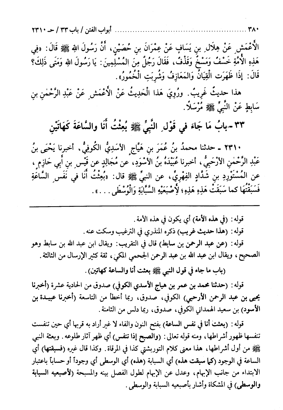 بُعِثْتُ أَنَا وَالسَّاعَةُ كَهَاتَيْنِ يَعْنِي السَّبَّابَةَ وَالْوُسْطَى [2213] قَوْلُهُ (حَدَّثَنَا مُحَمَّدُ بْنُ عُمَرَ بْنُ هَيَّاجٍ الْأَسَدِيُّ الْكُوفِيُّ) صَدُوقٌ مِنَ الْحَادِيَةَ عَشْرَةَ (حَدَّثَنَا يَحْيَى بْنُ عَبْدِ الرَّحْمَنِ الْأَرْحَبِيُّ) الْكُوفِيُّ صَدُوقٌ رُبَّمَا أَخْطَأَ مِنَ التَّاسِعَةِ (أَخْبَرَنَا عُبَيْدَةُ بْنُ الْأَسْوَدِ) بْنِ سَعِيدٍ الْهَمْدَانِيُّ الْكُوفِيُّ صَدُوقٌ رُبَّمَا دَلَّسَ مِنَ الثَّامِنَةِ