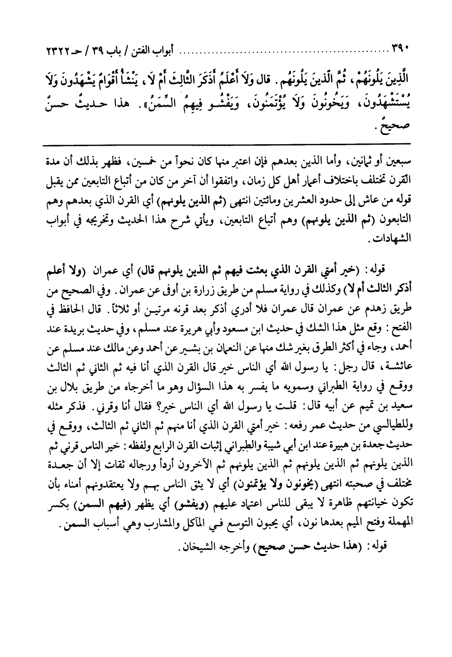 سَبْعِينَ أَوْ ثَمَانِينَ وَأَمَّا الَّذِينَ بَعْدَهُمْ فَإِنِ اعْتُبِرَ مِنْهَا كَانَ نَحْوًا مِنْ خَمْسِينَ فَظَهَرَ بِذَلِكَ أَنَّ مُدَّةَ الْقَرْنِ تَخْتَلِفُ بِاخْتِلَافِ أَعْمَارِ أَهْلِ كُلِّ زَمَانٍ وَاتَّفَقُوا أَنَّ آخِرَ مَنْ كَانَ مِنْ أَتْبَاعِ التَّابِعِينَ مِمَّنْ يُقْبَلُ قَوْلُهُ مَنْ عَاشَ إِلَى حُدُودِ الْعِشْرِينَ وَمِائَتَيْنِ انْتَهَى (ثُمَّ الَّذِينَ يَلُونَهُمْ) أَيِ الْقَرْنَ الَّذِي بَعْدَهُمْ وَهُمُ التَّابِعُونَ (ثُمَّ الَّذِينَ يَلُونَهُمْ) وَهُمْ أَتْبَاعُ التَّابِعِينَ وَيَأْتِي شَرْحُ هَذَا الْحَدِيثِ وَتَخْرِيجُهُ فِي أبواب الشهادات