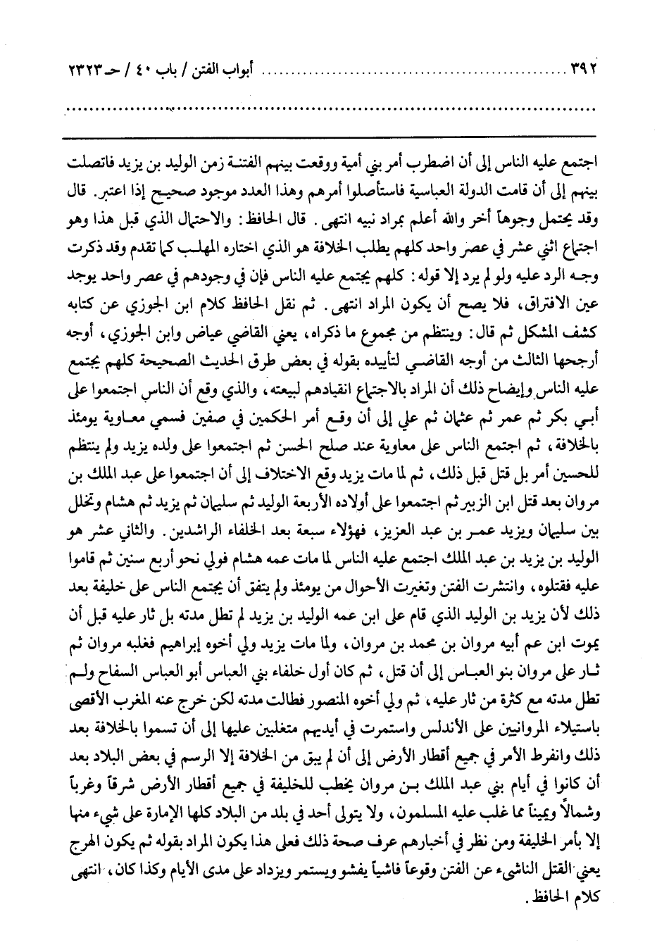 ثُمَّ نَقَلَ الْحَافِظُ كَلَامَ بن الْجَوْزِيِّ عَنْ كِتَابِهِ كَشْفِ الْمُشْكِلِ ثُمَّ قَالَ وَيَنْتَظِمُ مِنْ مَجْمُوعِ مَا ذَكَرَاهُ (يَعْنِي الْقَاضِيَ عياض وبن الْجَوْزِيِّ) أَوْجُهٌ أَرْجَحُهَا الثَّالِثُ مِنْ أَوْجُهِ الْقَاضِي لِتَأْيِيدِهِ بِقَوْلِهِ فِي بَعْضِ طُرُقِ الْحَدِيثِ الصَّحِيحَةِ كُلُّهُمْ يَجْتَمِعُ عَلَيْهِ النَّاسُ وَإِيضَاحُ ذَلِكَ أَنَّ الْمُرَادَ بِالِاجْتِمَاعِ انْقِيَادُهُمْ لِبَيْعَتِهِ وَالَّذِي وَقَعَ أَنَّ النَّاسَ اجْتَمَعُوا عَلَى أَبِي بَكْرٍ ثُمَّ عُمَرَ ثُمَّ عُثْمَانَ ثُمَّ عَلِيٍّ إِلَى أَنْ وَقَعَ أَمْرُ الْحَكَمَيْنِ فِي صِفِّينَ فَسُمِّيَ مُعَاوِيَةُ يَوْمَئِذٍ بِالْخِلَافَةِ ثُمَّ اجْتَمَعَ النَّاسُ عَلَى مُعَاوِيَةَ عِنْدَ صُلْحِ الْحَسَنِ ثُمَّ اجْتَمَعُوا عَلَى وَلَدِهِ يَزِيدَ وَلَمْ يَنْتَظِمْ لِلْحُسَيْنِ أَمْرٌ بَلْ قُتِلَ قَبْلَ ذَلِكَ ثُمَّ لَمَّا مَاتَ يَزِيدُ وَقَعَ الِاخْتِلَافُ إِلَى أَنِ اجْتَمَعُوا عَلَى عَبْدِ الْمَلِكِ بْنِ مروان بعد قتل بن الزُّبَيْرِ ثُمَّ اجْتَمَعُوا عَلَى أَوْلَادِهِ الْأَرْبَعَةِ الْوَلِيدِ ثُمَّ سُلَيْمَانَ ثُمَّ يَزِيدَ ثُمَّ هِشَامٍ وَتَخَلَّلَ بَيْنَ سُلَيْمَانَ وَيَزِيدَ عُمَرُ بْنُ عَبْدِ الْعَزِيزِ فَهَؤُلَاءِ سَبْعَةٌ بَعْدَ الْخُلَفَاءِ الرَّاشِدِينَ