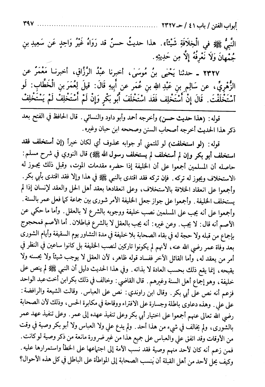 [2225] قَوْلُهُ لَوِ اسْتَخْلَفْتَ لَوْ لِلتَّمَنِّي أَوْ جَوَابُهُ مَحْذُوفٌ أَيْ لَكَانَ خَيْرًا إِنْ أَسْتَخْلِفْ فَقَدِ اسْتَخْلَفَ أَبُو بَكْرٍ وَإِنْ لَمْ أَسْتَخْلِفْ لَمْ يستخلف رسول صَلَّى اللَّهُ عَلَيْهِ وَسَلَّمَ قَالَ النَّوَوِيُّ فِي شَرْحِ مُسْلِمٍ حَاصِلُهُ أَنَّ الْمُسْلِمِينَ أَجْمَعُوا عَلَى أَنَّ الْخَلِيفَةَ إِذَا حَضَرَهُ مُقَدِّمَاتُ الْمَوْتِ وَقَبْلَ ذَلِكَ يَجُوزُ لَهُ الِاسْتِخْلَافُ وَيَجُوزُ لَهُ تَرْكُهُ فَإِنْ تَرَكَهُ فَقَدِ اقْتَدَى بِالنَّبِيِّ صَلَّى اللَّهُ عَلَيْهِ وَسَلَّمَ فِي هَذَا وَإِلَّا فَقَدِ اقْتَدَى بِأَبِي بَكْرٍ وَأَجْمَعُوا عَلَى انْعِقَادِ الْخِلَافَةِ بِالِاسْتِخْلَافِ وعلى انعقاد بِعَقْدِ أَهْلِ الْحَلِّ وَالْعَقْدِ لِإِنْسَانٍ إِذَا لَمْ يَسْتَخْلِفِ الْخَلِيفَةُ وَأَجْمَعُوا عَلَى جَوَازِ جَعْلِ الْخَلِيفَةِ الْأَمْرَ شُورَى بَيْنَ جَمَاعَةٍ كَمَا فَعَلَ عُمَرُ بِالسِّتَّةِ وَأَجْمَعُوا عَلَى أَنَّهُ يَجِبُ عَلَى الْمُسْلِمِينَ نَصْبُ خَلِيفَةٍ وَوُجُوبُهُ بِالشَّرْعِ لَا بِالْعَقْلِ وَأَمَّا مَا حُكِيَ عَنِ الْأَصَمِّ أَنَّهُ قَالَ لَا يَجِبُ وَعَنْ غَيْرِهِ أَنَّهُ يَجِبُ بِالْعَقْلِ لَا بِالشَّرْعِ فَبَاطِلَانِ أَمَّا الْأَصَمُّ فَمَحْجُوجٌ بِإِجْمَاعِ مَنْ قَبْلَهُ وَلَا حُجَّةَ لَهُ فِي بَقَاءِ الصَّحَابَةِ بِلَا خَلِيفَةٍ فِي مُدَّةِ التَّشَاوُرِ يَوْمَ السَّقِيفَةِ وَأَيَّامَ الشُّورَى بَعْدَ وَفَاةِ عُمَرَ رَضِيَ اللَّهُ عَنْهُ لِأَنَّهُمْ لَمْ يَكُونُوا تَارِكِينَ لِنَصْبِ الْخَلِيفَةِ بَلْ كَانُوا سَاعِينَ فِي النَّظَرِ فِي أَمْرِ مَنْ يُعْقَدُ لَهُ وَأَمَّا الْقَائِلُ الْآخَرُ فَفَسَادُ قَوْلِهِ ظَاهِرٌ لِأَنَّ الْعَقْلَ لَا يُوجِبُ شَيْئًا وَلَا يُحَسِّنُهُ وَلَا يُقَبِّحُهُ إِنَّمَا يَقَعُ ذَلِكَ بِحَسَبِ الْعَادَةِ لَا بِذَاتِهِ وَفِي هَذَا الْحَدِيثِ دَلِيلٌ أَنَّ النَّبِيَّ صَلَّى اللَّهُ عَلَيْهِ وَسَلَّمَ لَمْ يَنُصَّ عَلَى خَلِيفَةٍ وَهُوَ إِجْمَاعُ أَهْلِ السُّنَّةِ وَغَيْرِهِمْ قَالَ الْقَاضِي وَخَالَفَ فِي ذَلِكَ بَكْرُ بْنُ أُخْتِ عَبْدِ الْوَاحِدِ فَزَعَمَ أَنَّهُ نص على أبي بكر وقال أن رواندي نَصَّ عَلَى الْعَبَّاسِ وَقَالَتِ الشِّيعَةُ وَالرَّافِضَةُ عَلَى عَلِيٍّ وَهَذِهِ دَعَاوَى بَاطِلَةٌ وَجَسَارَةٌ عَلَى الِافْتِرَاءِ وَوَقَاحَةٌ فِي مُكَابَرَةِ الْحِسِّ وَذَلِكَ لِأَنَّ الصَّحَابَةَ رَضِيَ اللَّهُ تَعَالَى عَنْهُمْ أَجْمَعُوا عَلَى اخْتِيَارِ أَبِي بَكْرٍ وَعَلَى تَنْفِيذِ عَهْدِهِ إِلَى عُمَرَ وَعَلَى تَنْفِيذِ عَهْدِ عُمَرَ بِالشُّورَى وَلَمْ يُخَالِفْ فِي شَيْءٍ مِنْ هَذَا أَحَدٌ وَلَمْ يَدَّعِ عَلِيٌّ وَلَا الْعَبَّاسُ وَلَا أَبُو بَكْرٍ وَصِيَّةً فِي وَقْتٍ مِنَ الْأَوْقَاتِ وَقَدِ اتَّفَقَ عَلِيٌّ وَالْعَبَّاسُ عَلَى جَمِيعِ هَذَا مِنْ غَيْرِ ضَرُورَةٍ مَانِعَةٍ مِنْ ذِكْرِ وَصِيَّةٍ لَوْ كَانَتْ فَمَنْ زَعَمَ أَنَّهُ كَانَ لِأَحَدٍ مِنْهُمْ وَصِيَّةٌ فَقَدْ نَسَبَ الْأُمَّةَ إِلَى اجْتِمَاعِهَا عَلَى الْخَطَأِ وَاسْتِمْرَارِهَا عَلَيْهِ وَكَيْفَ يَحِلُّ لِأَحَدٍ مِنْ أَهْلِ الْقِبْلَةِ أَنْ يَنْسُبَ الصَّحَابَةَ إِلَى الْمُوَاطَأَةِ عَلَى الْبَاطِلِ فِي كُلِّ هَذِهِ الْأَحْوَالِ