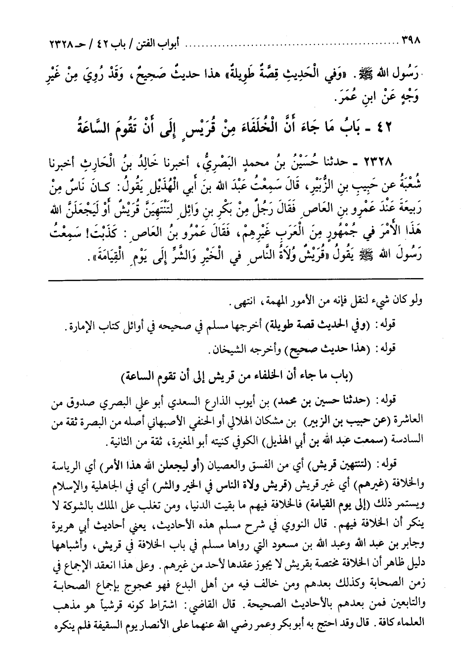 قَالَ النَّوَوِيُّ فِي شَرْحِ مُسْلِمٍ هَذِهِ الْأَحَادِيثُ (يَعْنِي أَحَادِيثَ أَبِي هُرَيْرَةَ وَجَابِرِ بْنِ عَبْدِ اللَّهِ وَعَبْدِ اللَّهِ بْنِ مَسْعُودٍ الَّتِي رَوَاهَا مُسْلِمٌ فِي بَابِ الْخِلَافَةِ فِي قُرَيْشٍ) وَأَشْبَاهُهَا دَلِيلٌ ظَاهِرٌ أَنَّ الْخِلَافَةَ مُخْتَصَّةٌ بِقُرَيْشٍ لَا يَجُوزُ عَقْدُهَا لِأَحَدٍ مِنْ غَيْرِهِمْ