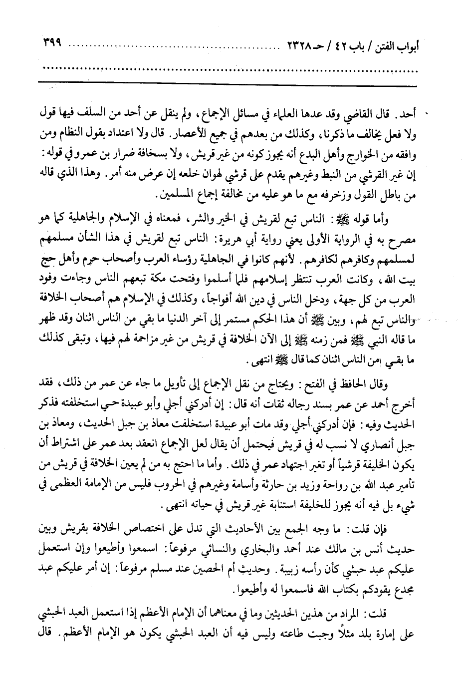 وَقَالَ الْحَافِظُ فِي الْفَتْحِ وَيَحْتَاجُ مَنْ نَقَلَ الْإِجْمَاعَ إِلَى تَأْوِيلِ مَا جَاءَ عَنْ عُمَرَ مِنْ ذَلِكَ فَقَدْ أَخْرَجَ أَحْمَدُ عَنْ عُمَرَ بِسَنَدٍ رِجَالُهُ ثِقَاتٌ أَنَّهُ قَالَ إِنْ أَدْرَكَنِي أَجَلِي وَأَبُو عُبَيْدَةَ حَيٌّ اسْتَخْلَفْتُهُ فَذَكَرَ الْحَدِيثَ وَفِيهِ فَإِنْ أَدْرَكَنِي أَجَلِي وَقَدْ مَاتَ أَبُو عُبَيْدَةَ اسْتَخْلَفْتُ مُعَاذَ بْنَ جَبَلٍ الْحَدِيثَ وَمُعَاذُ بْنُ جَبَلٍ أَنْصَارِيٌّ لَا نَسَبَ لَهُ فِي قُرَيْشٍ فَيُحْتَمَلُ أَنْ يُقَالَ لَعَلَّ الْإِجْمَاعَ انْعَقَدَ بَعْدَ عُمَرَ عَلَى اشْتِرَاطِ أَنْ يَكُونَ الْخَلِيفَةُ قُرَشِيًّا أَوْ تَغَيَّرَ اجْتِهَادُ عُمَرَ فِي ذَلِكَ