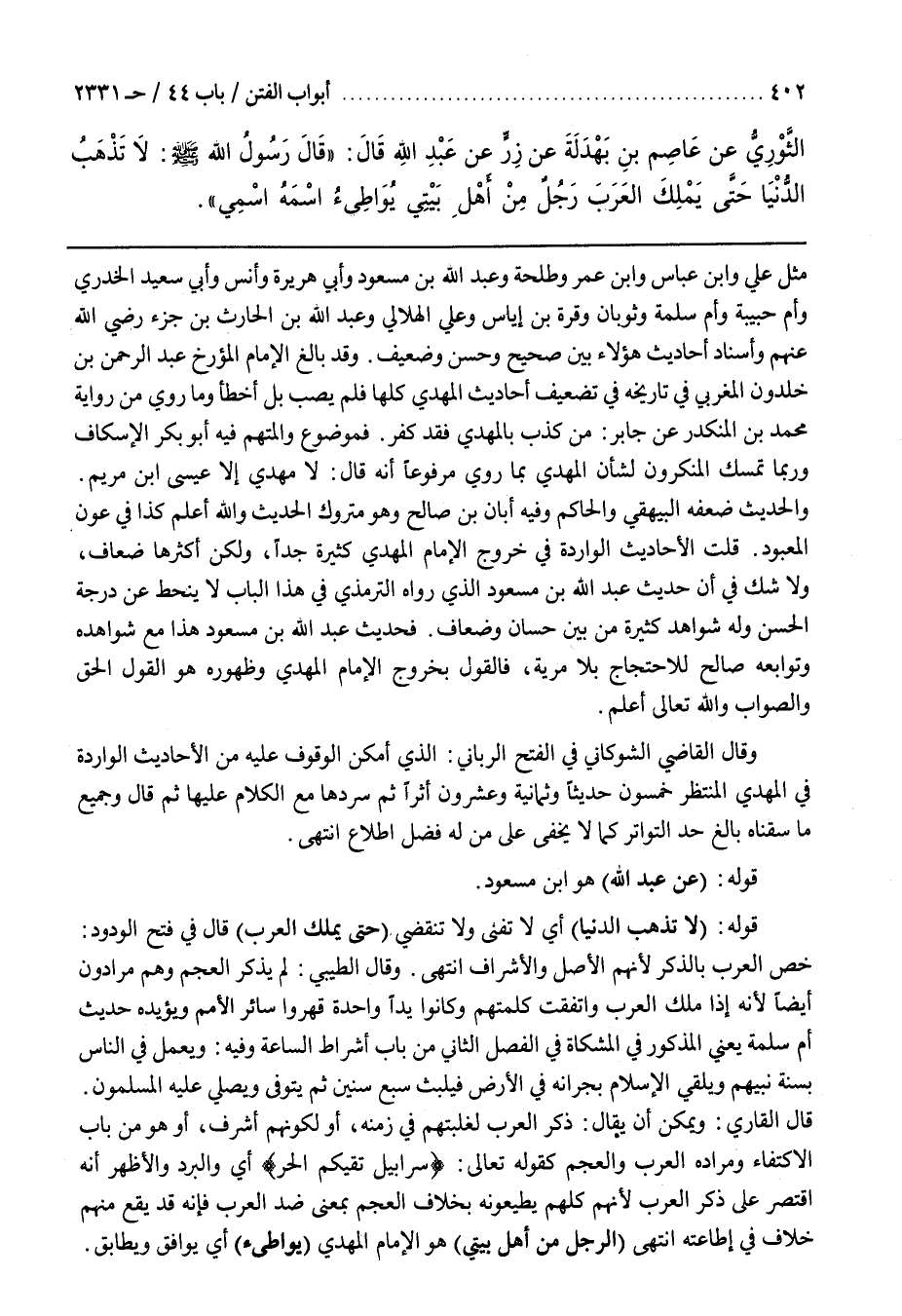 قُلْتُ الْأَحَادِيثُ الْوَارِدَةُ فِي خُرُوجِ الْإِمَامِ الْمَهْدِيِّ كَثِيرَةٌ جِدًّا وَلَكِنَّ أَكْثَرَهَا ضِعَافٌ وَلَا شَكَّ فِي أَنَّ حَدِيثَ عَبْدِ اللَّهِ بْنِ مَسْعُودٍ الَّذِي رَوَاهُ التِّرْمِذِيُّ فِي هَذَا الْبَابِ لَا يَنْحَطُّ عَنْ دَرَجَةِ الْحَسَنِ وَلَهُ شَوَاهِدُ كَثِيرَةٌ مِنْ بَيْنِ حِسَانٍ وَضِعَافٍ