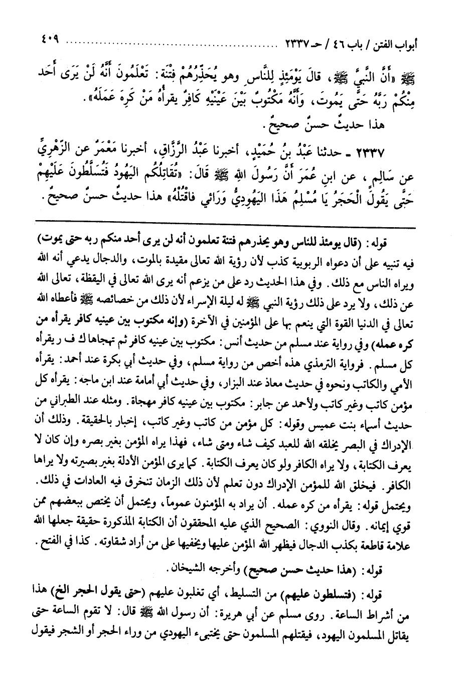 فَرِوَايَةُ التِّرْمِذِيِّ هَذِهِ أَخَصُّ مِنْ رِوَايَةِ مُسْلِمٍ وَفِي حَدِيثِ أَبِي بَكْرَةَ عِنْدَ أحمد يقرأه الْأُمِّيُّ وَالْكَاتِبُ وَنَحْوُهُ فِي حَدِيثِ مُعَاذٍ عِنْدَ البزار وفي حديث أبي أمامة عند بن ماجة يقرأه كُلُّ مُؤْمِنٍ كَاتِبٍ وَغَيْرِ كَاتِبٍ وَلِأَحْمَدَ عَنْ جَابِرٍ مَكْتُوبٌ بَيْنَ عَيْنَيْهِ كَافِرٌ مُهَجَّاةٌ