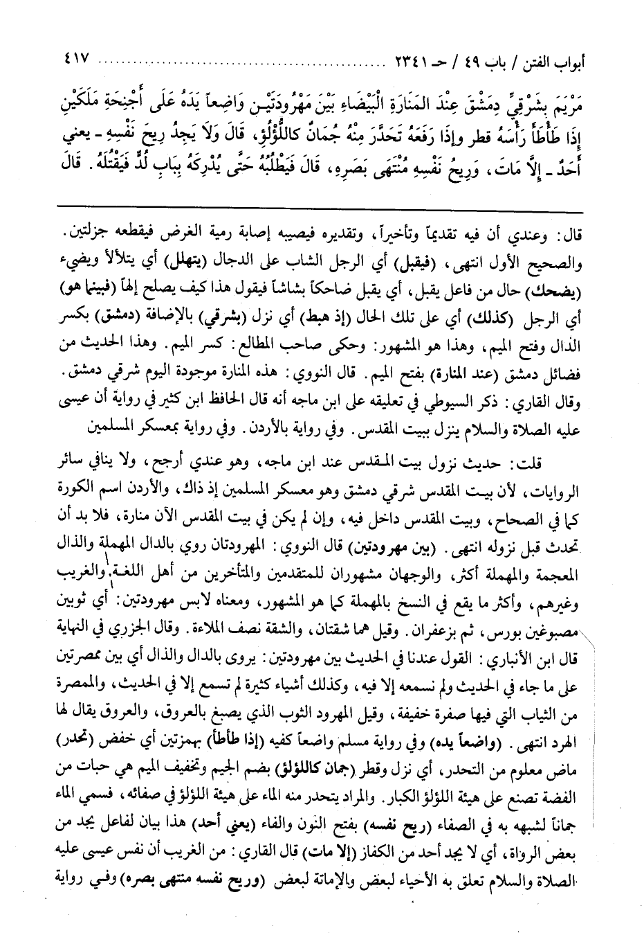 قلت حديث نزول ببيت المقدس عند بن مَاجَهْ وَهُوَ عِنْدِي أَرْجَحُ وَلَا يُنَافِي سَائِرَ الرِّوَايَاتِ لِأَنَّ بِبَيْتِ الْمَقْدِسِ شَرْقِيَّ دِمَشْقَ وَهُوَ مُعَسْكَرُ الْمُسْلِمِينَ إِذْ ذَاكَ وَالْأُرْدُنُّ اسْمُ الْكُورَةِ كَمَا فِي الصِّحَاحِ وَبَيْتُ الْمَقْدِسِ دَاخِلٌ فِيهِ وَإِنْ لَمْ يَكُنْ فِي بَيْتِ الْمَقْدِسِ الْآنَ مَنَارَةٌ فَلَا بُدَّ أَنْ تَحْدُثَ قَبْلَ نُزُولِهِ انْتَهَى