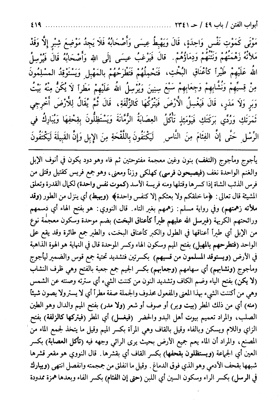 يَأْجُوجَ وَمَأْجُوجَ (النَّغَفَ) بِنُونٍ وَغَيْنٍ مُعْجَمَةٍ مَفْتُوحَتَيْنِ ثُمَّ فَاءٍ وَهُوَ دُودٌ يَكُونُ فِي أُنُوفِ الإبل والغنم الواحدة نغف (فَيُصْبِحُونَ فَرْسَى) كَهَلْكَى وَزْنًا وَمَعْنًى وَهُوَ جَمْعُ فَرِيسٍ كَقَتِيلِ وَقَتْلَى مِنْ فَرَسَ الذِّئْبُ الشَّاةَ إِذَا كَسَرَهَا وَقَتَلَهَا وَمِنْهُ فَرِيسَةُ الْأَسَدِ (كَمَوْتِ نَفْسٍ وَاحِدَةٍ) لِكَمَالِ الْقُدْرَةِ وَتَعَلُّقِ الْمَشِيئَةِ قَالَ تَعَالَى مَا خَلْقُكُمْ وَلَا بَعْثُكُمْ إِلَّا كَنَفْسٍ واحدة (وَيَهْبِطُ) أَيْ يَنْزِلُ مِنَ الطُّورِ (وَقَدْ مَلَأَتْهُ زَهَمَتُهُمْ) وَفِي رِوَايَةِ مُسْلِمٍ زَهَمُهُمْ بِغَيْرِ التَّاءِ