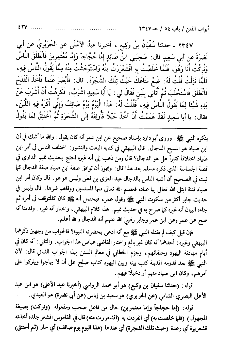 قَالَ الْبَيْهَقِيُّ فِي كِتَابِهِ الْبَعْثُ وَالنُّشُورُ اخْتَلَفَ النَّاسُ فِي أَمْرِ بن صَيَّادٍ اخْتِلَافًا كَثِيرًا هَلْ هُوَ الدَّجَّالُ قَالَ وَمَنْ ذَهَبَ إِلَى أَنَّهُ غَيْرُهُ احْتَجَّ بِحَدِيثِ تَمِيمٍ الدَّارِيِّ فِي قِصَّةِ الْجَسَّاسَةِ الَّذِي ذَكَرَهُ مُسْلِمٌ بَعْدَ هَذَا قَالَ وَيَجُوزُ أَنْ تُوَافِقَ صفة بن صَيَّادٍ صِفَةَ الدَّجَّالِ كَمَا ثَبَتَ فِي الصَّحِيحِ أَنَّ أَشْبَهَ النَّاسِ بِالدَّجَّالِ عَبْدُ الْعُزَّى بْنُ قَطَنٍ وَلَيْسَ هُوَ هُوَ