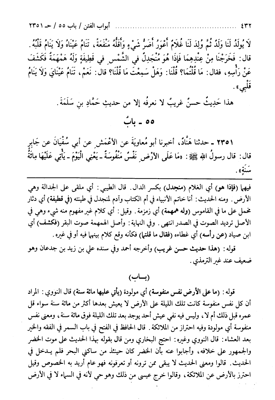 2 - باب [2250] قَوْلُهُ (مَا عَلَى الْأَرْضِ نَفْسٌ مَنْفُوسَةٌ) أَيْ مَوْلُودَةٌ (يَأْتِي عَلَيْهَا مِائَةُ سَنَةٍ) قَالَ النَّوَوِيُّ الْمُرَادُ أَنَّ كُلَّ نَفْسٍ مَنْفُوسَةٍ كَانَتْ تِلْكَ اللَّيْلَةَ عَلَى الْأَرْضِ لَا يَعِيشُ بَعْدَهَا أَكْثَرَ مِنْ مِائَةِ سَنَةٍ سَوَاءٌ قَلَّ عُمُرُهُ قَبْلَ ذَلِكَ أَمْ لَا وَلَيْسَ فِيهِ نَفْيُ عَيْشِ أَحَدٍ يُوجَدُ بَعْدَ تِلْكَ اللَّيْلَةِ فَوْقَ مِائَةِ سَنَةٍ وَمَعْنَى نَفْسٍ مَنْفُوسَةٍ أَيْ مَوْلُودَةٍ وَفِيهِ احْتِرَازٌ مِنَ الْمَلَائِكَةِ