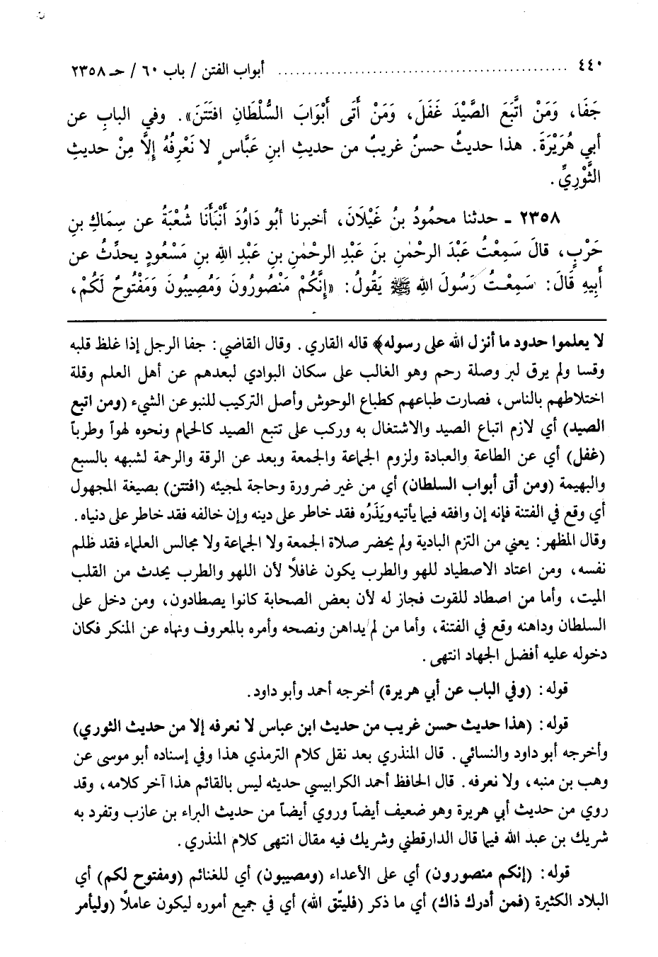 وَقَالَ الْقَاضِي جَفَا الرَّجُلُ إِذَا غَلُظَ قَلْبُهُ وَقَسَا وَلَمْ يَرِقَّ لِبِرٍّ وَصِلَةِ رَحِمٍ وَهُوَ الْغَالِبُ عَلَى سُكَّانِ الْبَوَادِي لِبُعْدِهِمْ عَنْ أَهْلِ الْعِلْمِ وَقِلَّةِ اخْتِلَاطِهِمْ بِالنَّاسِ فَصَارَتْ طِبَاعُهُمْ كَطِبَاعِ الْوُحُوشِ وَأَصْلُ التَّرْكِيبِ لِلنُّبُوِّ عَنِ الشَّيْءِ (وَمَنِ اتَّبَعَ الصَّيْدَ) أَيْ لَازَمَ اتِّبَاعَ الصَّيْدِ وَالِاشْتِغَالَ بِهِ وَرَكِبَ عَلَى تَتَبُّعِ الصَّيْدِ كَالْحَمَامِ وَنَحْوِهِ لَهْوًا وَطَرَبًا (غَفَلَ) أَيْ عَنِ الطَّاعَةِ وَالْعِبَادَةِ وَلُزُومِ الْجَمَاعَةِ وَالْجُمُعَةِ وَبَعُدَ عَنِ الرِّقَّةِ وَالرَّحْمَةِ لِشَبَهِهِ بِالسَّبُعِ وَالْبَهِيمَةِ (وَمَنْ أَتَى أَبْوَابَ السُّلْطَانِ) أَيْ مِنْ غَيْرِ ضَرُورَةٍ وَحَاجَةٍ لِمَجِيئِهِ (افْتُتِنَ) بِصِيغَةِ الْمَجْهُولِ أَيْ وَقَعَ فِي الْفِتْنَةِ فَإِنَّهُ إِنْ وَافَقَهُ فِيمَا يَأْتِيهِ وَيَذَرُهُ فَقَدْ خَاطَرَ عَلَى دِينِهِ وَإِنْ خَالَفَهُ فَقَدْ خَاطَرَ عَلَى دُنْيَاهُ
