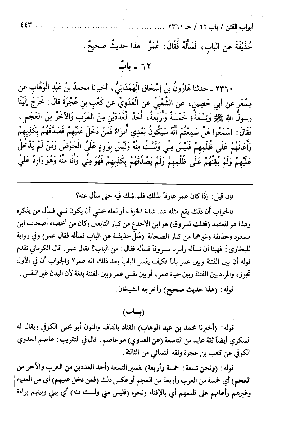 0 - باب [2259] قَوْلُهُ (أَخْبَرَنَا مُحَمَّدُ بْنُ عَبْدِ الْوَهَّابِ) الْقَنَّادُ بِالْقَافِ وَالنُّونِ أَبُو يَحْيَى الْكُوفِيُّ وَيُقَالُ لَهُ السُّكَّرِيُّ أَيْضًا ثِقَةٌ عَابِدٌ مِنَ التَّاسِعَةِ (عَنِ الْعَدَوِيِّ) هُوَ عَاصِمٌ