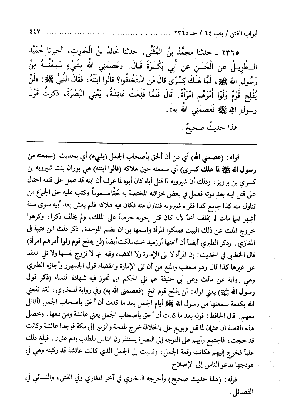 [2262] قَوْلُهُ (عَصَمَنِي اللَّهُ) أَيْ مِنْ أَنْ أَلْحَقَ بِأَصْحَابِ الْجَمَلِ (بِشَيْءٍ) أَيْ بِحَدِيثٍ (سَمِعْتُهُ مِنْ رَسُولِ اللَّهِ صَلَّى اللَّهُ عَلَيْهِ وَسَلَّمَ لم هَلَكَ كِسْرَى) أَيْ سَمِعْتُهُ حِينَ هَلَاكِهِ (قَالُوا ابنته) هي بوران بنت شيرويه بنت كِسْرَى بْنِ بِرْوِيزَ وَذَلِكَ أَنَّ شِيرَوَيْهِ لَمَّا قَتَلَ أَبَاهُ كَانَ أَبُوهُ لَمَّا عَرَفَ أَنَّ ابْنَهُ قَدْ عَمِلَ عَلَى قَتْلِهِ احْتَالَ عَلَى قَتْلِ ابْنِهِ بَعْدَ مَوْتِهِ فَعَمِلَ فِي بَعْضِ خَزَائِنِهِ الْمُخْتَصَّةِ بِهِ حُقًّا مَسْمُومًا وَكَتَبَ عَلَيْهِ حُقُّ الْجِمَاعِ مَنْ تَنَاوَلَ مِنْهُ كَذَا جَامَعَ كَذَا فَقَرَأَهُ شِيرَوَيْهِ فَتَنَاوَلَ مِنْهُ فَكَانَ فِيهِ هَلَاكُهُ فَلَمْ يَعِشْ بَعْدَ أَبِيهِ سِوَى سِتَّةَ أَشْهُرٍ فَلَمَّا مَاتَ لَمْ يُخَلِّفْ أَخًا لِأَنَّهُ كَانَ قَتَلَ إِخْوَتَهُ حِرْصًا عَلَى الْمُلْكِ وَلَمْ يُخَلِّفْ ذَكَرًا وَكَرِهُوا خُرُوجَ الْمُلْكِ عَنْ ذَلِكَ الْبَيْتِ فَمَلَّكُوا الْمَرْأَةَ وَاسْمُهَا بُورَانُ بِضَمِّ الْمُوَحَّدَةِ ذكر ذلك بن قُتَيْبَةَ فِي الْمَغَازِي وَذَكَرَ الطَّبَرِيُّ أَيْضًا أَنَّ أختها أرزميدخت مَلَكَتْ أَيْضًا (لَنْ يُفْلِحَ قَوْمٌ وَلَّوْا أَمْرَهُمُ امْرَأَةً) قَالَ الْخَطَّابِيُّ فِي الْحَدِيثِ إِنَّ الْمَرْأَةَ لَا تَلِي الْإِمَارَةَ وَلَا الْقَضَاءَ وَفِيهِ إِنَّهَا لَا تُزَوِّجُ نَفْسَهَا وَلَا تَلِي الْعَقْدَ عَلَى غَيْرِهَا كَذَا قَالَ وَهُوَ مُتَعَقَّبٌ وَالْمَنْعُ مِنْ أَنْ تَلِيَ الْإِمَارَةَ وَالْقَضَاءَ قَوْلُ الْجُمْهُورِ وَأَجَازَهُ الطَّبَرِيُّ وَهِيَ رِوَايَةٌ عَنْ مَالِكٍ وَعَنْ أَبِي حَنِيفَةَ عَمَّا تَلِي الْحُكْمَ فِيمَا تَجُوزُ فِيهِ شهادة النساء (ذكر قَوْلُ رَسُولِ اللَّهِ صَلَّى اللَّهُ عَلَيْهِ وَسَلَّمَ) يَعْنِي قَوْلَهُ لَنْ يُفْلِحَ قَوْمٌ إِلَخْ (فَعَصَمَنِي الله له) وَفِي رِوَايَةٍ لِلْبُخَارِيِّ لَقَدْ نَفَعَنِي اللَّهُ بِكَلِمَةٍ سمعتها مِنْ رَسُولِ اللَّهِ صَلَّى اللَّهُ عَلَيْهِ وَسَلَّمَ أَيَّامَ الْجَمَلِ بَعْدَ مَا كِدْتُ أَنْ أَلْحَقَ بِأَصْحَابِ الْجَمَلِ فَأُقَاتِلَ مَعَهُمْ قَالَ الْحَافِظُ قَوْلُهُ بَعْدَ مَا كِدْتُ أَنْ أَلْحَقَ بِأَصْحَابِ الدجمل يعنى عائشة ومن معها ومحصل هذا الْقِصَّةِ أَنَّ عُثْمَانَ لَمَّا قُتِلَ وَبُويِعَ عَلِيٌّ بِالْخِلَافَةِ خَرَجَ طَلْحَةُ وَالزُّبَيْرُ إِلَى مَكَّةَ فَوَجَدَا عَائِشَةَ وَكَانَتْ قَدْ حَجَّتْ فَاجْتَمَعَ رَأْيُهُمْ عَلَى التَّوَجُّهِ إِلَى الْبَصْرَةِ يَسْتَنْفِرُونَ النَّاسَ لِلطَّلَبِ بِدَمِ عُثْمَانَ فَبَلَغَ ذَلِكَ عَلِيًّا فَخَرَجَ إِلَيْهِمْ فَكَانَتْ وَقْعَةُ الْجَمَلِ وَنُسِبَتْ إِلَى الْجَمَلِ الَّذِي كَانَتْ عَائِشَةُ قَدْ رَكِبَتْهُ وَهِيَ فِي هَوْدَجِهَا تَدْعُو النَّاسَ إِلَى الْإِصْلَاحِ