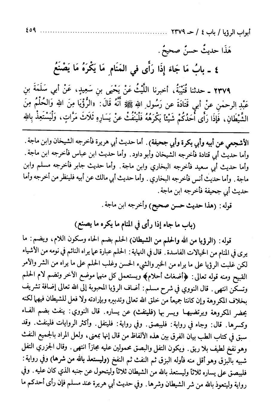 وَقَالَ الْجَزَرِيُّ التَّفْلُ شَبِيهٌ بِالْبَزْقِ وَهُوَ أَقَلُّ مِنْهُ فَأَوَّلُهُ الْبَزْقُ ثُمَّ النفث ثُمَّ النَّفْخُ (وَلْيَسْتَعِذْ بِاللَّهِ مِنْ شَرِّهَا) وَفِي رِوَايَةٍ فَلْيَبْصُقْ عَلَى يَسَارِهِ ثَلَاثًا وَلْيَسْتَعِذْ بِاللَّهِ مِنَ الشَّيْطَانِ ثَلَاثًا وَلْيَتَحَوَّلْ عَنْ جَنْبِهِ الَّذِي كَانَ عَلَيْهِ