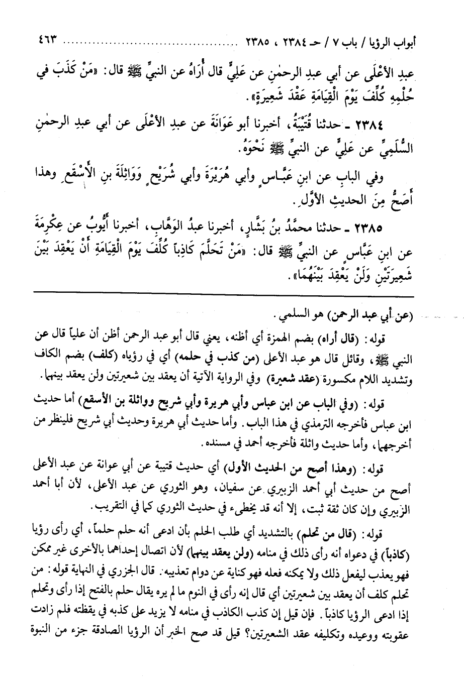 [2283] قَوْلُهُ (قَالَ مَنْ تَحَلَّمَ) بِالتَّشْدِيدِ أَيْ طَلَبَ الْحُلْمَ بِأَنِ ادَّعَى أَنَّهُ حَلَمَ حُلْمًا أَيْ رَأَى رُؤْيَا (كَاذِبًا) فِي دَعْوَاهُ أَنَّهُ رَأَى ذَلِكَ فِي مَنَامِهِ (وَلَنْ يَعْقِدَ بَيْنَهُمَا) لِأَنَّ اتِّصَالَ إِحْدَاهُمَا بِالْأُخْرَى غَيْرُ مُمْكِنٍ فَهُوَ يُعَذَّبُ لِيَفْعَلَ ذَلِكَ وَلَا يُمْكِنُهُ فِعْلُهُ فَهُوَ كِنَايَةٌ عَنْ دَوَامِ تَعْذِيبِهِ