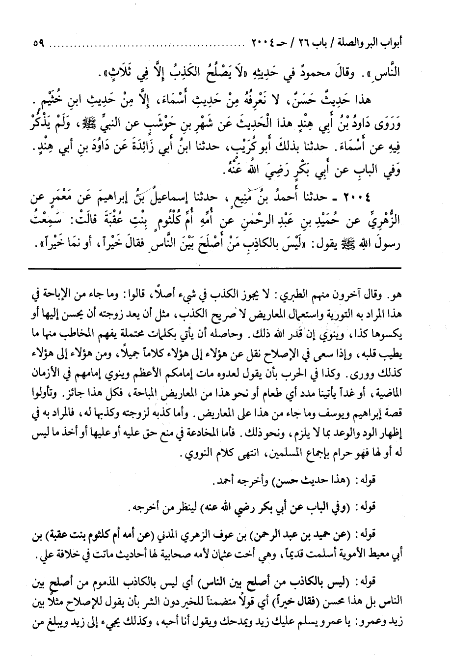 وَقَالَ آخَرُونَ مِنْهُمُ الطَّبَرِيُّ لَا يَجُوزُ الْكَذِبُ فِي شَيْءٍ أَصْلًا قَالُوا وَمَا جَاءَ مِنَ الْإِبَاحَةِ فِي هَذَا الْمُرَادُ بِهِ التَّوْرِيَةُ وَاسْتِعْمَالُ الْمَعَارِيضِ لَا صَرِيحُ الْكَذِبِ مِثْلُ أَنْ يَعِدَ زَوْجَتَهُ أَنْ يُحْسِنَ إِلَيْهَا أَوْ يَكْسُوَهَا كَذَا وَيَنْوِيَ إِنْ قَدَّرَ اللَّهُ ذَلِكَ